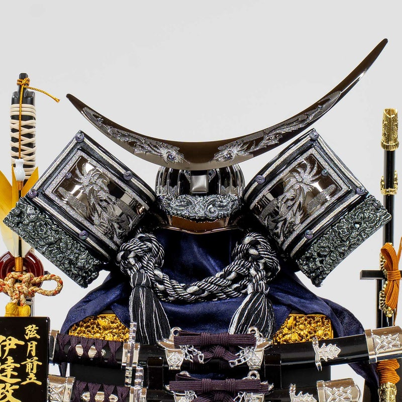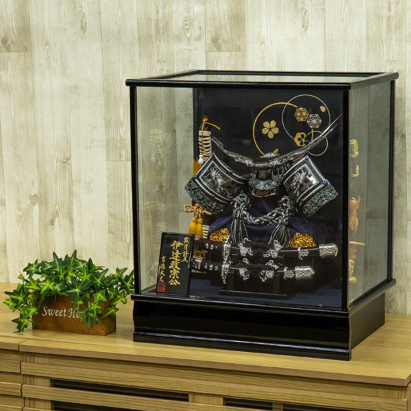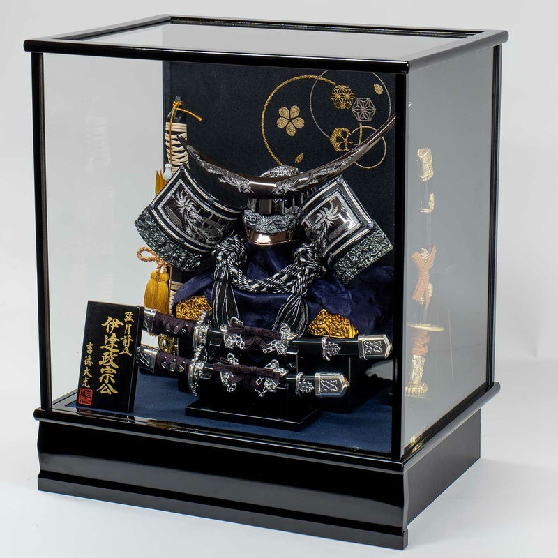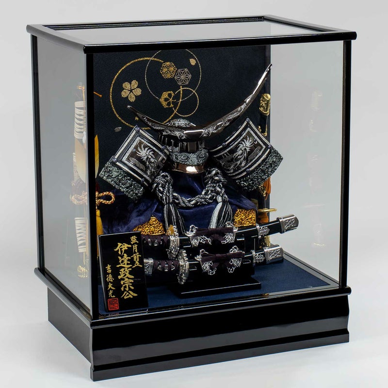 伊達政宗公の兜を黒塗ケースと合わせた迫力あるケース飾りです。