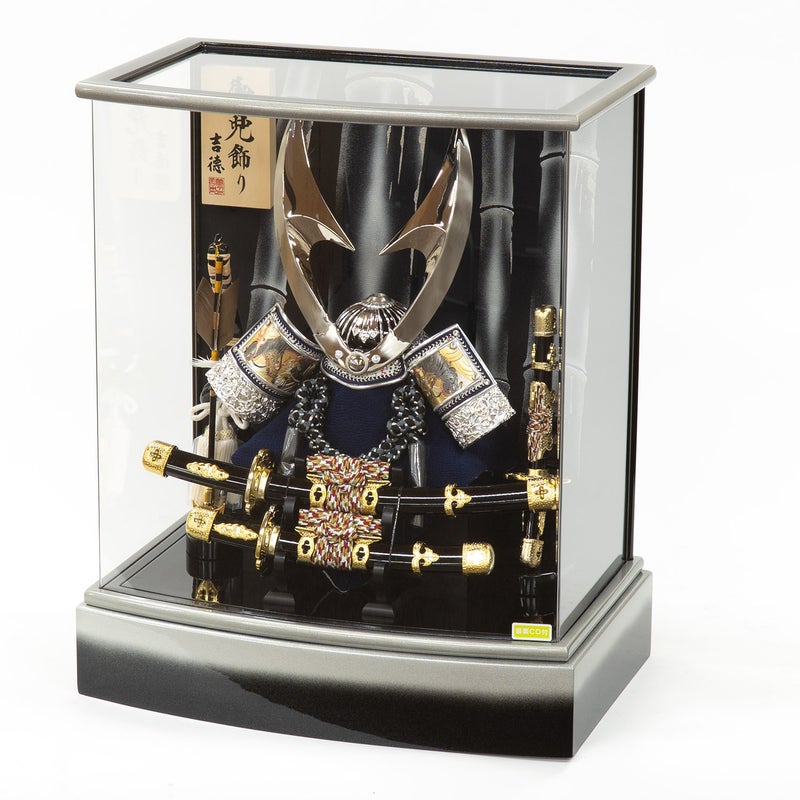 お子様の健やかな成長を願い ケースの背景に竹を描いた兜ケース飾りです。