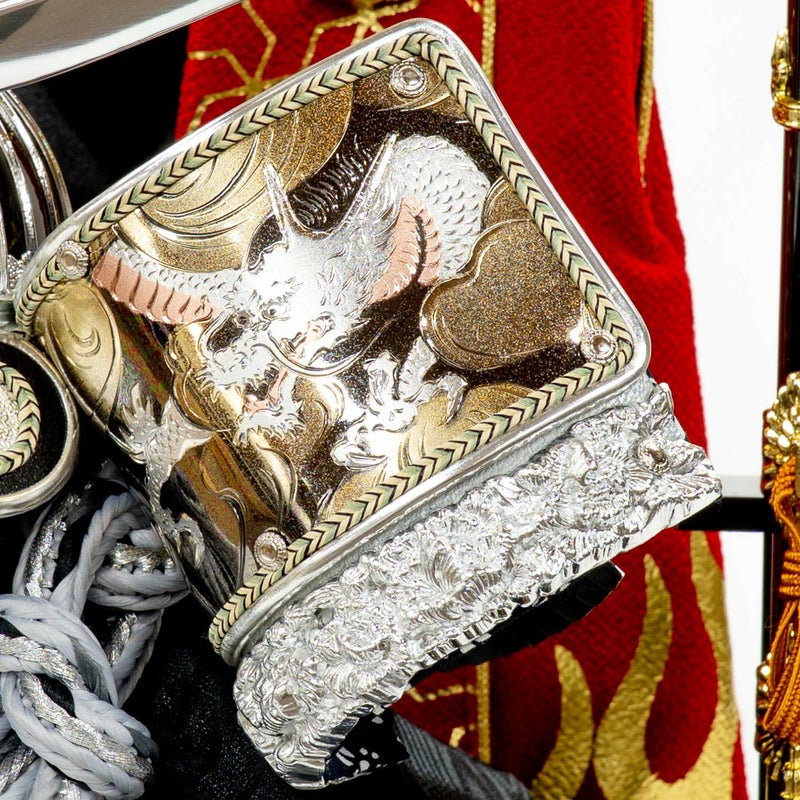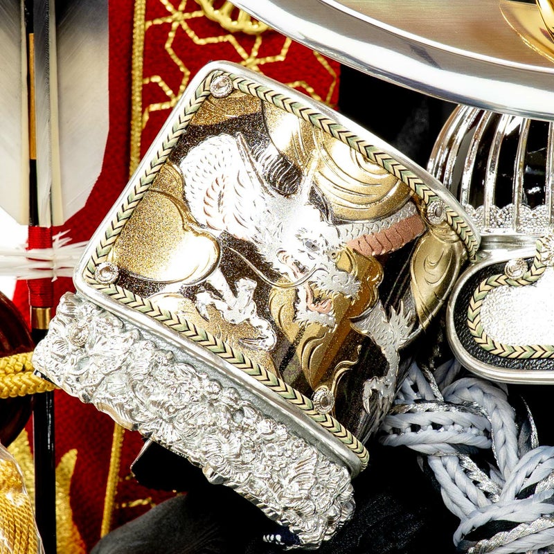 ■兜の吹返しには迫力ある「龍」を彫金で描きました。
