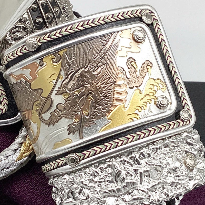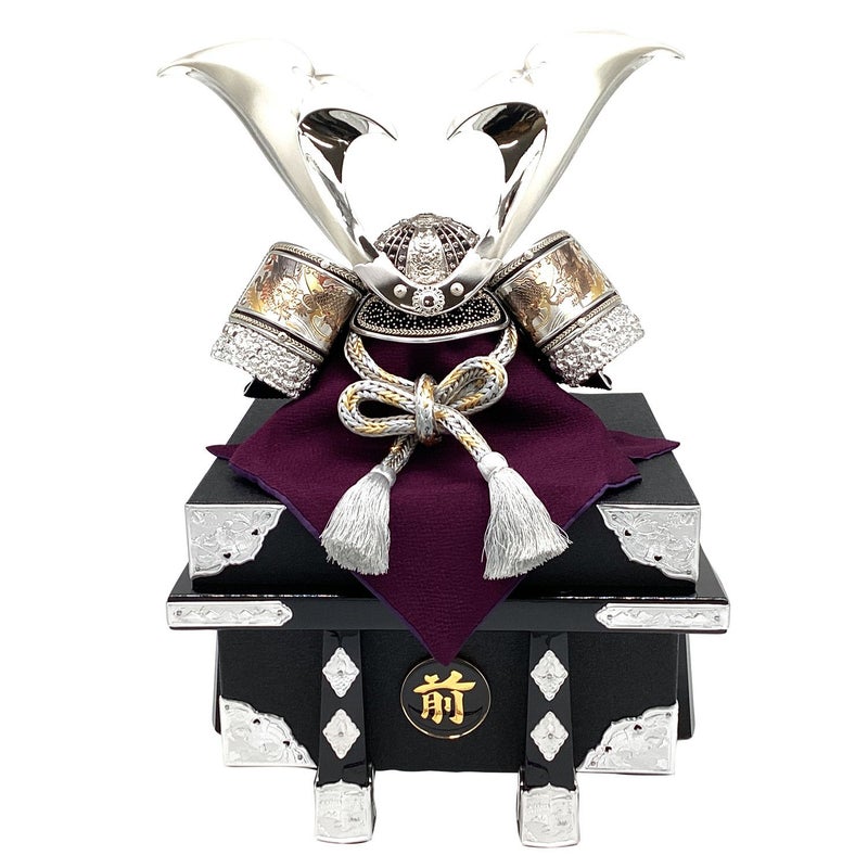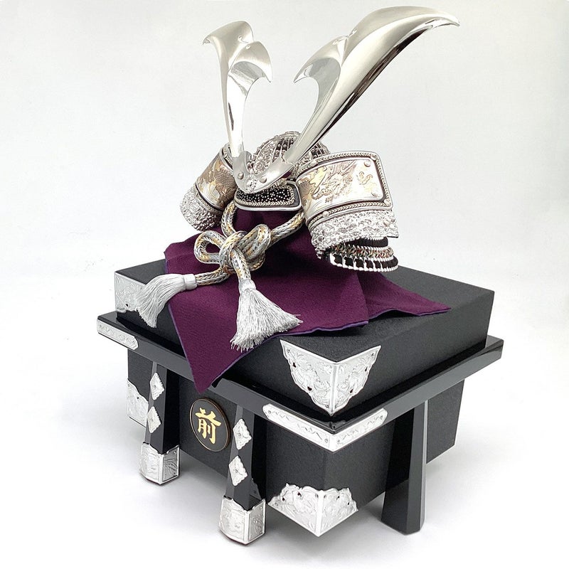 兜の吹き返しに龍の彫金を施しました。兜をしまうことができる櫃(ひつ)付きのセットです。