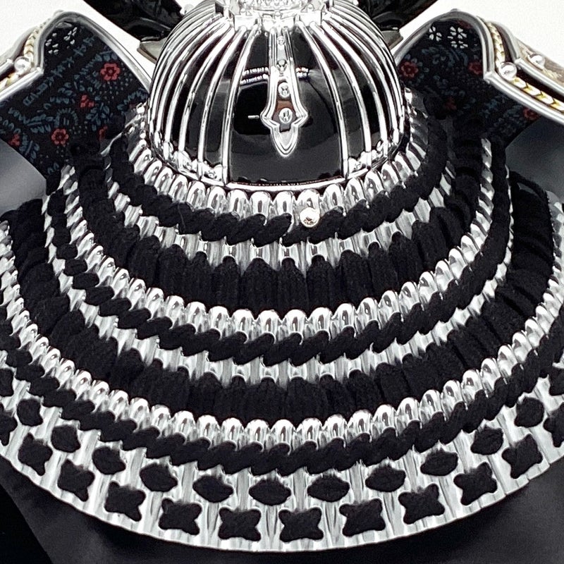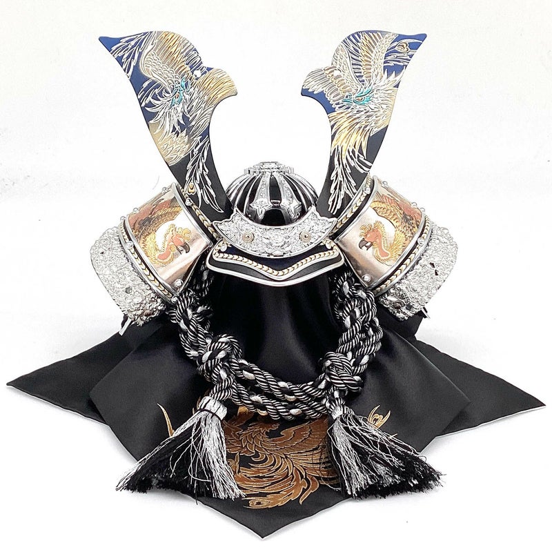 銀小札黒絲縅の鳳凰のモチーフを随所にあしらった兜です。
