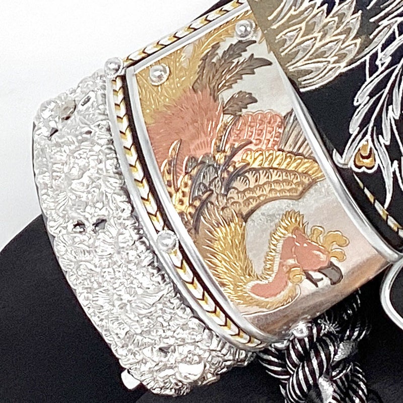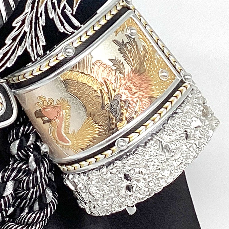鳳凰は中国で古くから伝説の鳥とされ、平和と幸福の象徴です。兜の吹き返しは彫金で鳳凰を描き、兜の鍬形にも鳳凰をあしらいました。