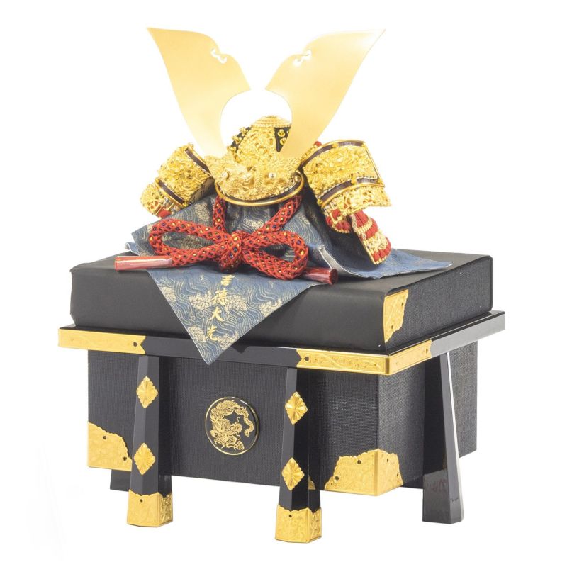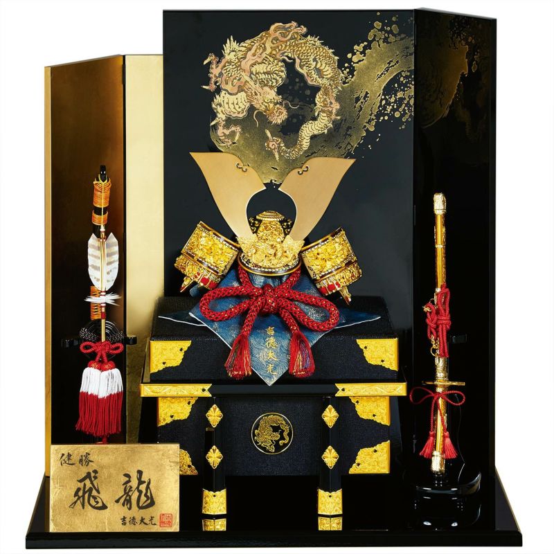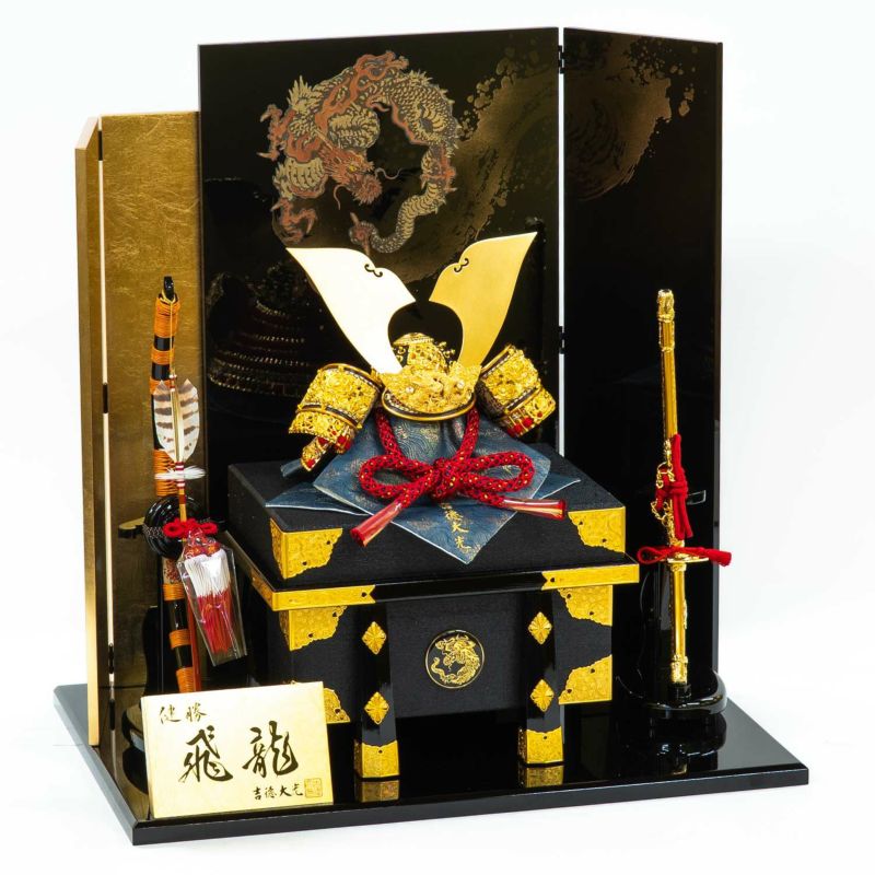 美しい加賀蒔絵と箔押を組み合わせた屏風に金小札赤絲縅の兜をセットした「飛龍之兜飾り」。
