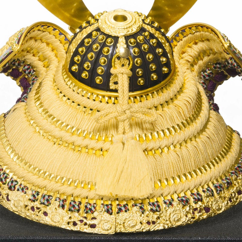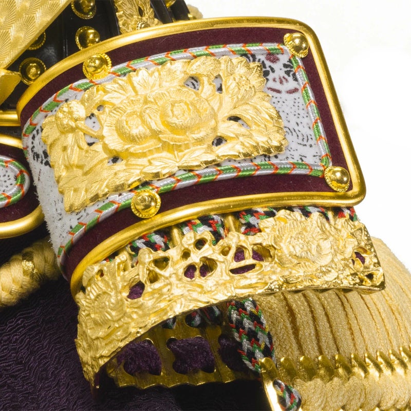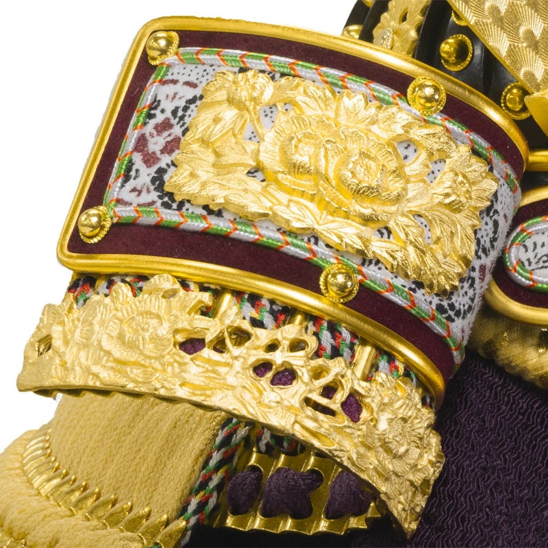 ■兜の小札に純金箔押しを施し、裾に牡丹柄の飾り金具を配した兜。