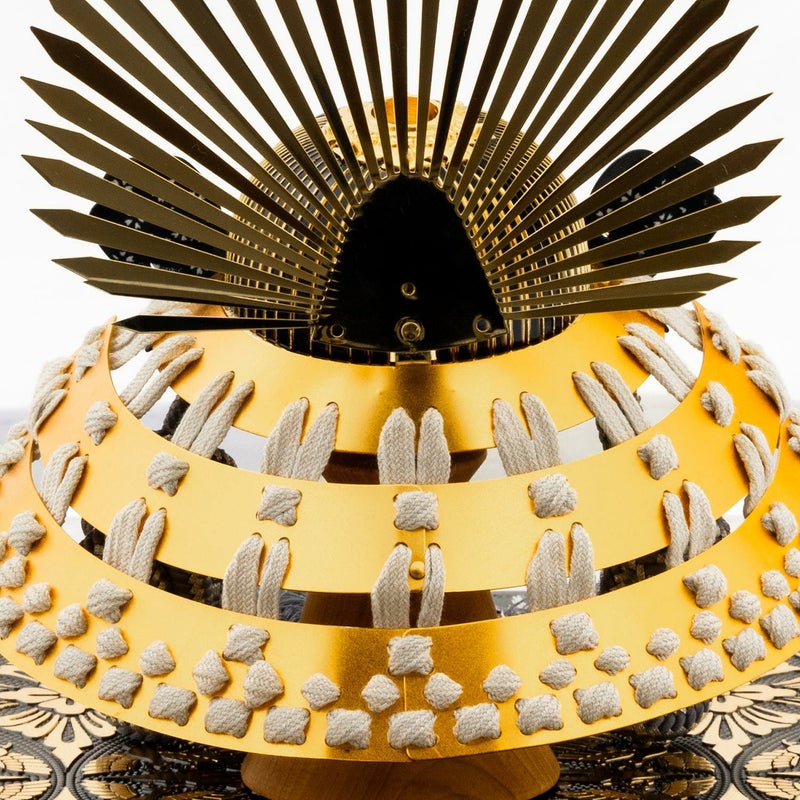 ■兜は存在感ある豊臣秀吉公の馬藺後立兜。金の板札に白絲素掛縅。