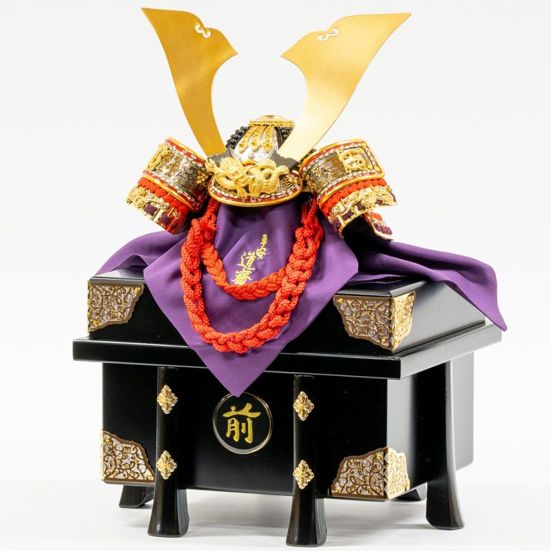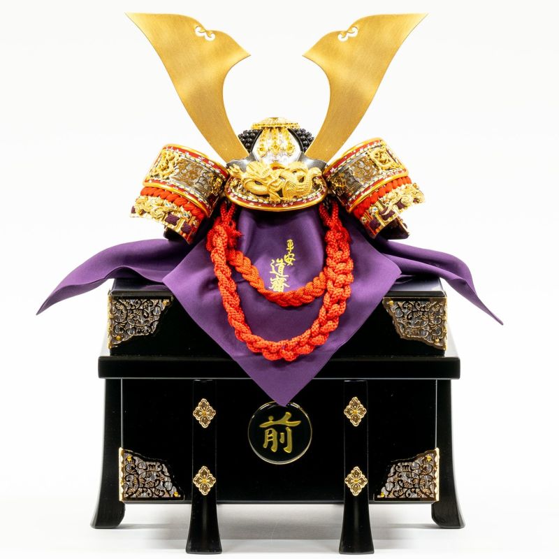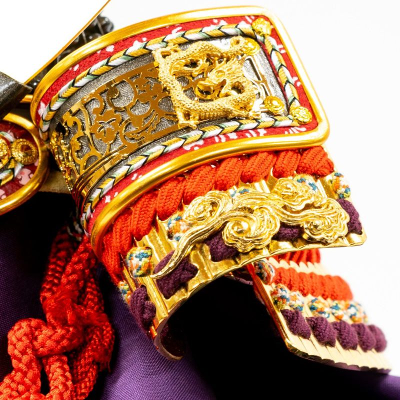 「龍」の金物を用いた、平安道斎作の純金箔押小札の兜です。