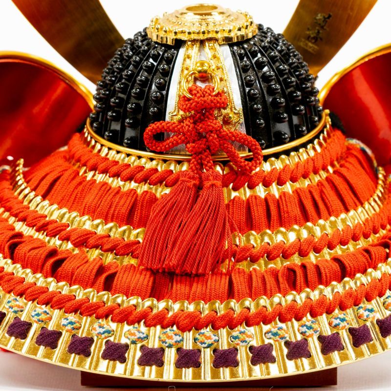 兜は箔押小札を使用。小札の裏に薄い箔を貼りその上から透き漆を塗った白檀塗(びゃくだんぬり)が施されており、正絹の赤絲で縅した手の込んだ造りとなっています。