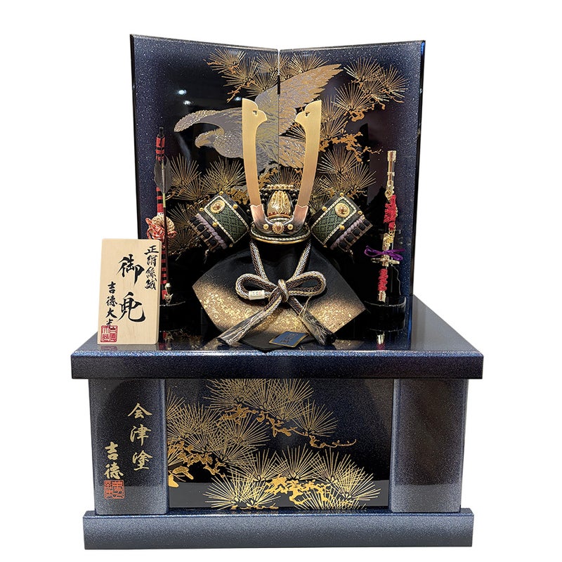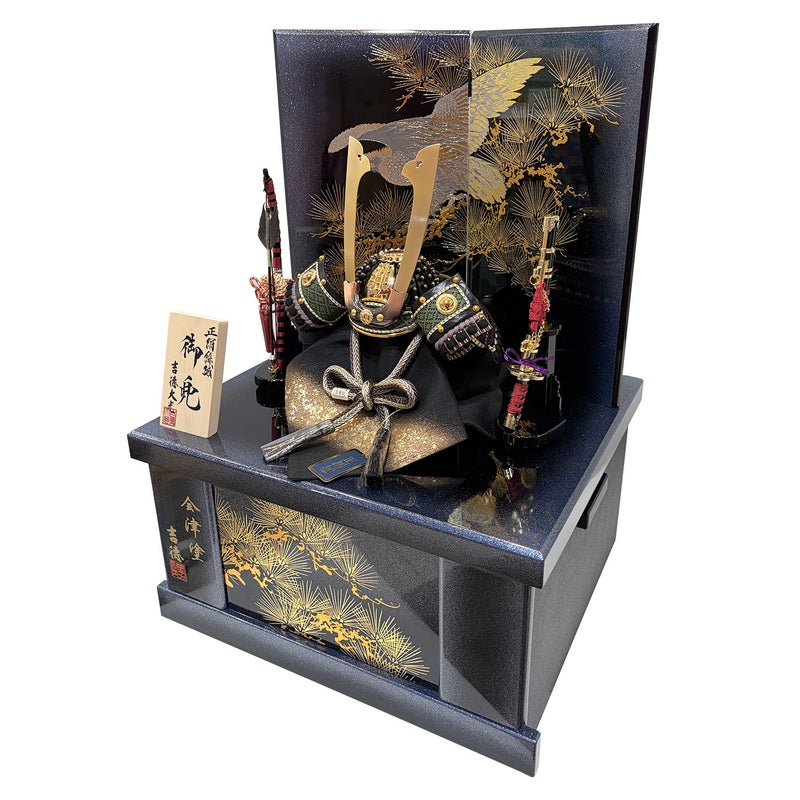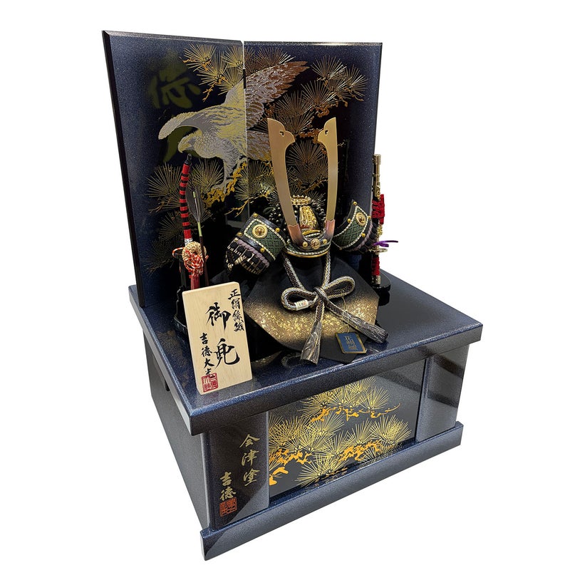 迫力ある鷹を描いた屏風と長鍬形が印象的な兜を組み合わせた収納箱飾りです。