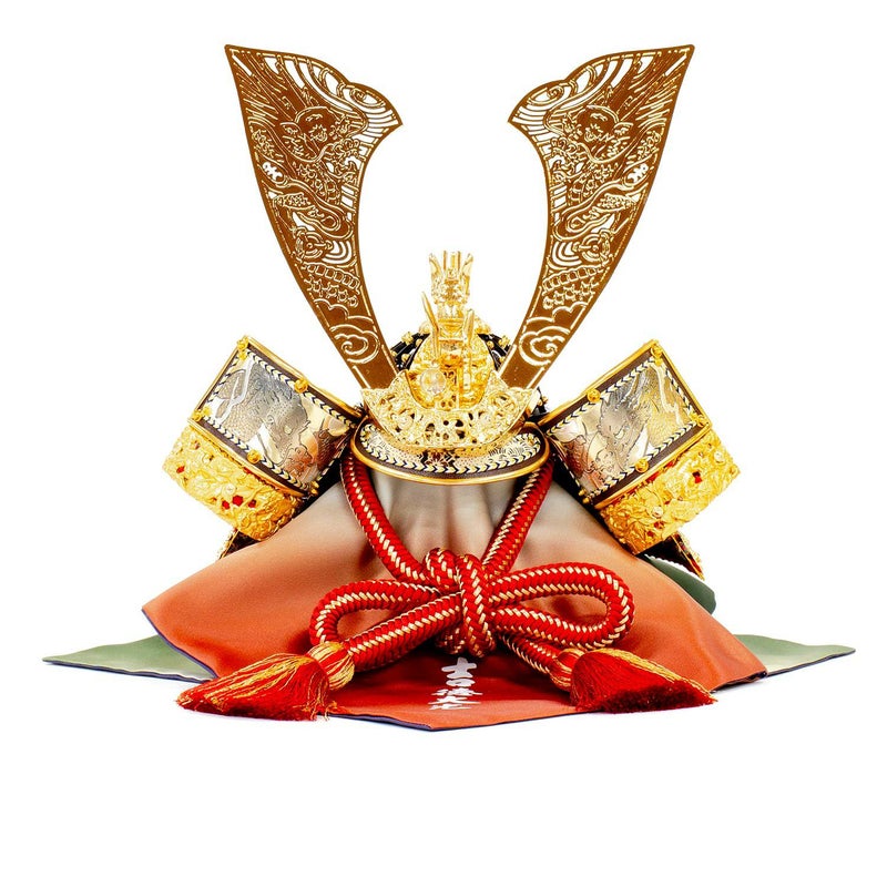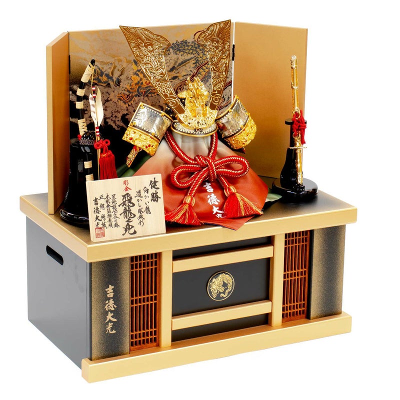 力強さを感じさせる兜を用いた、飛龍シリーズの兜収納箱飾り。