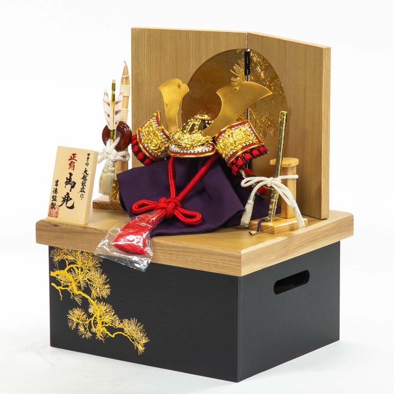 間口 30cm とコンパクトサイズな、飾る場所を選ばないフタ式兜収納箱飾りです。