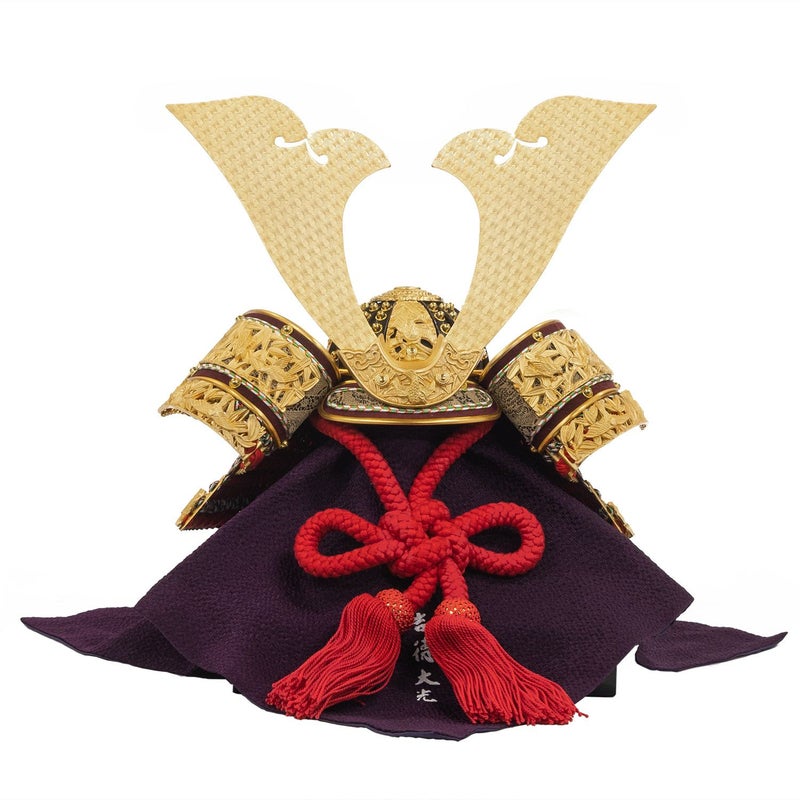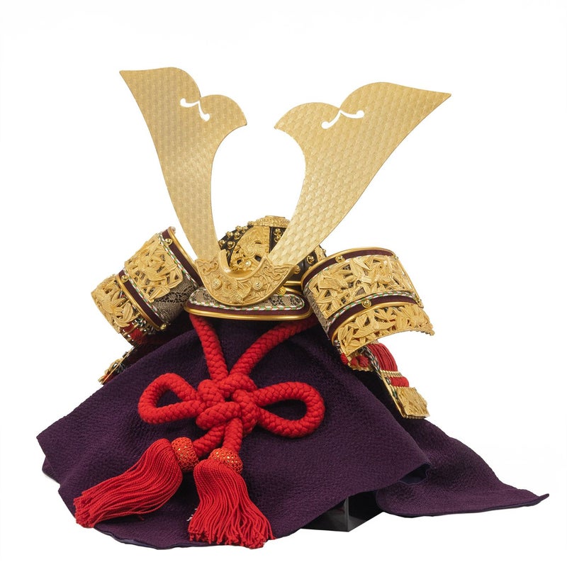 兜の小札に純金箔を押した兜を用いた収納箱飾りです。