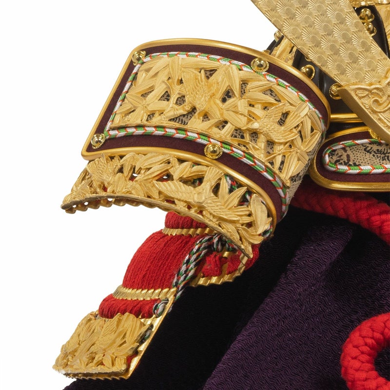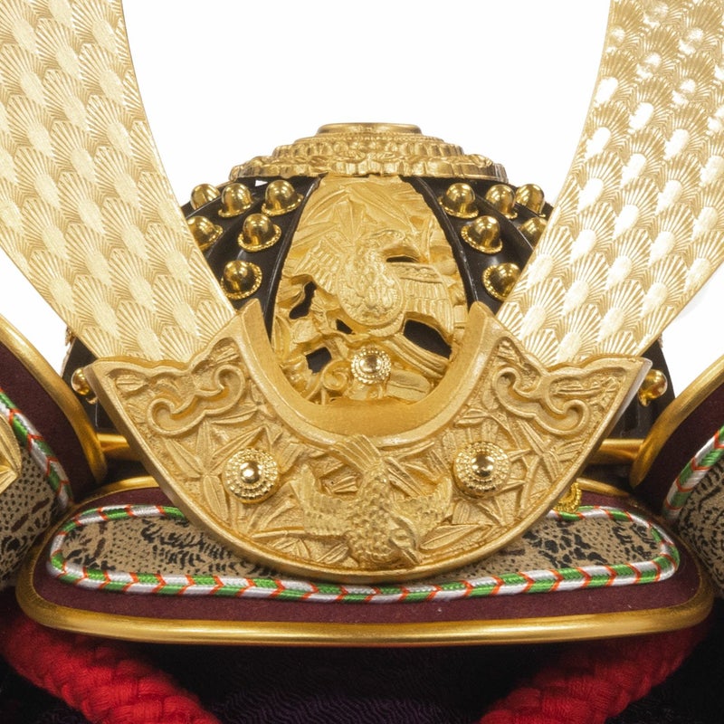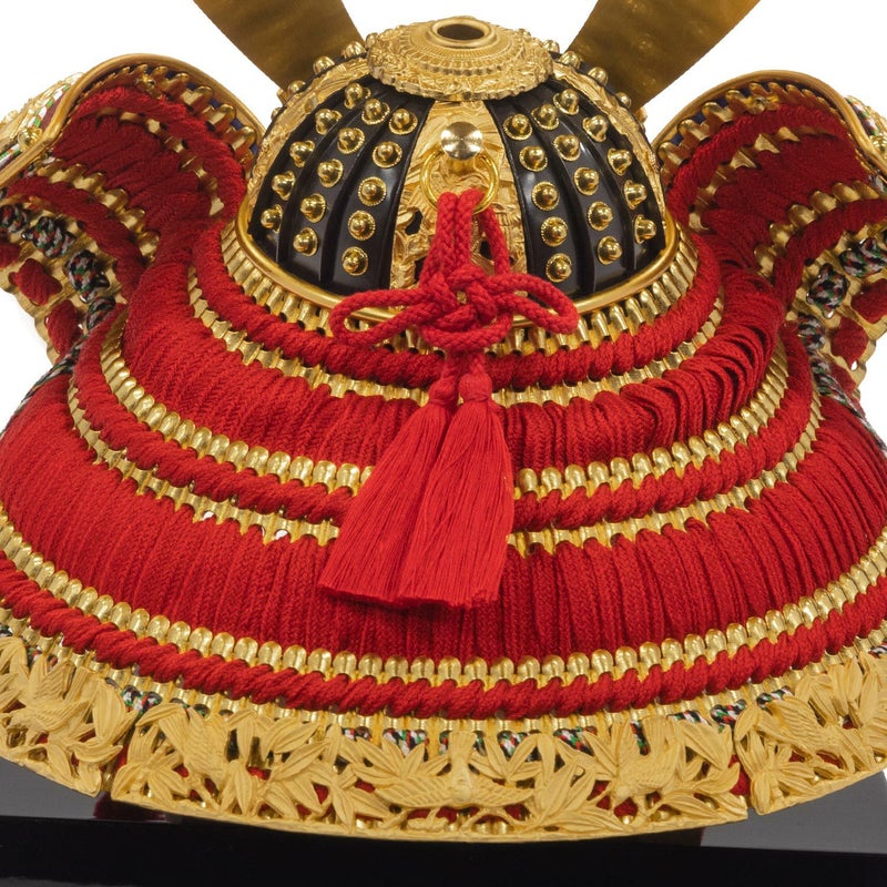 ■兜は大鍬形に正絹赤絲で縅し、この兜の特徴である小札は純金箔押し仕上げ。