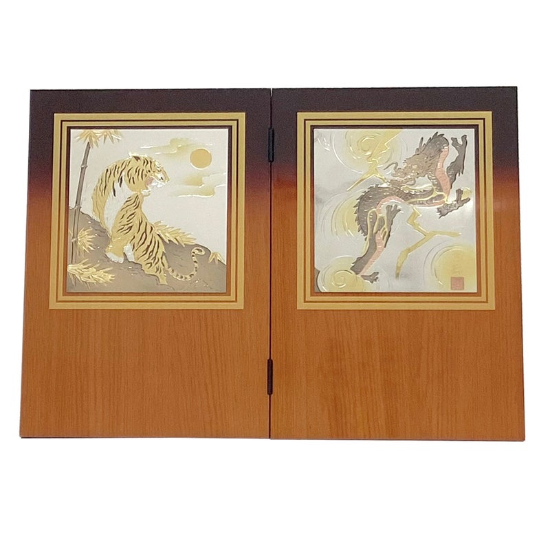 ■二曲の屏風は彫金で勇ましい「龍虎」を描きました。