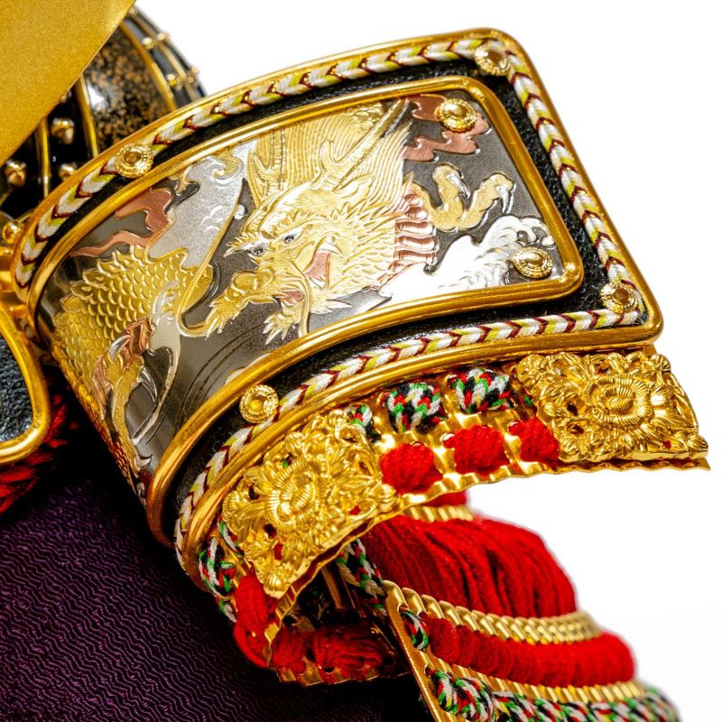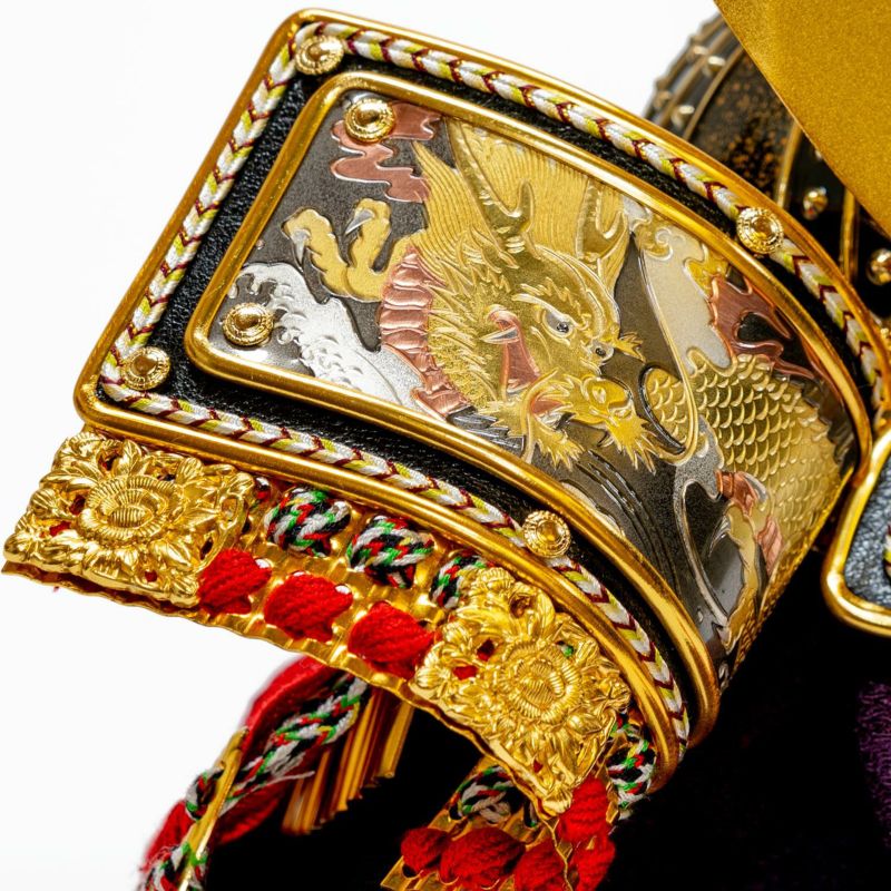 立体鍬形を用いた兜の吹返しには彫金で龍を描きました。