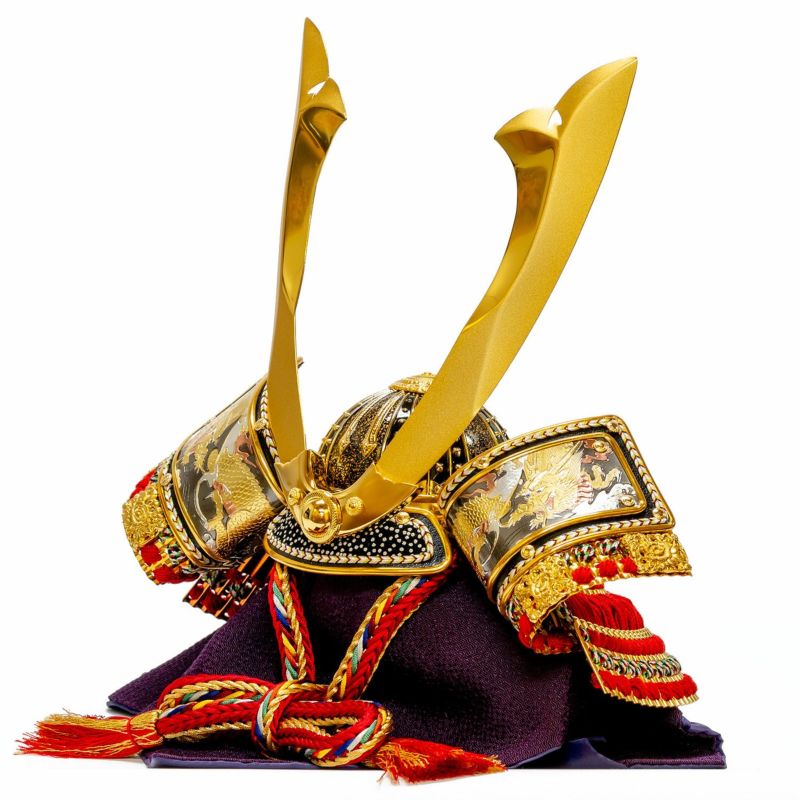 屏風に描いた迫力ある龍がより兜を引き立てる収納箱飾りです。