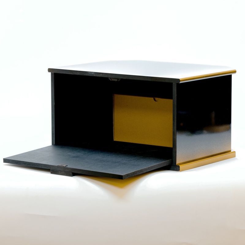 赤絲で縅した兜が力強さを感じさせる兜収納箱飾りです。