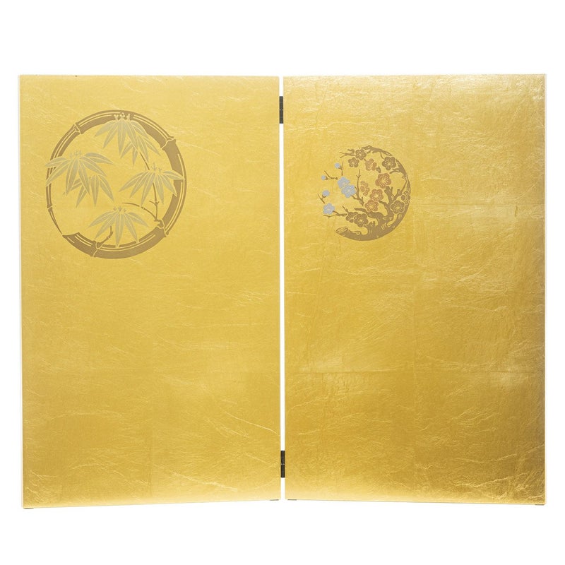 ■箔押しに「松竹梅」を描きその上にコーティングを施した二曲屏風。