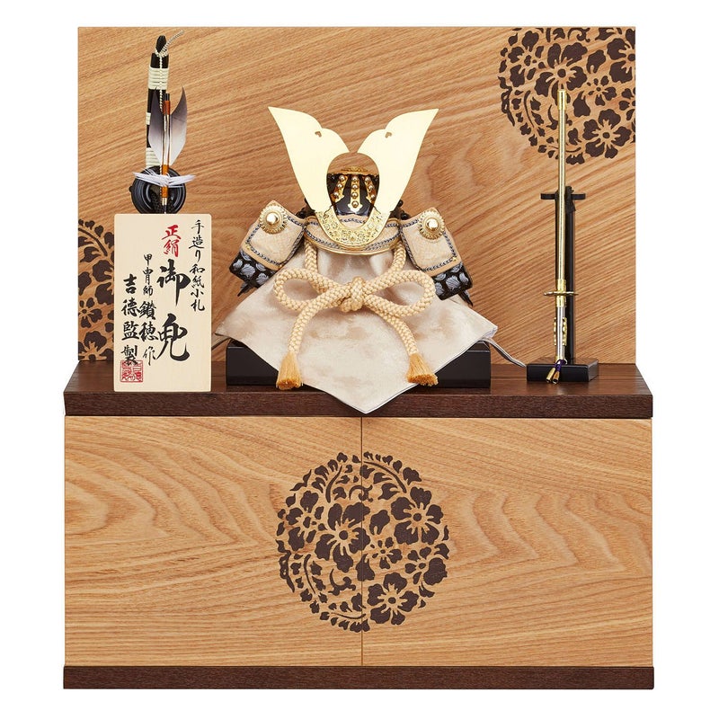 木目の美しい屏風や収納箱に合わせた、和紙小札兜収納箱飾りです。