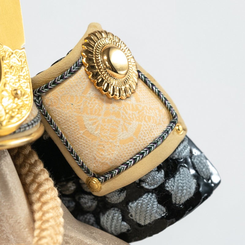 ■兜の小札には、和紙をカシュー漆等で塗り固めたものを用いて再現しています。
