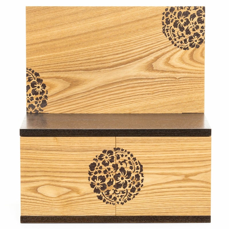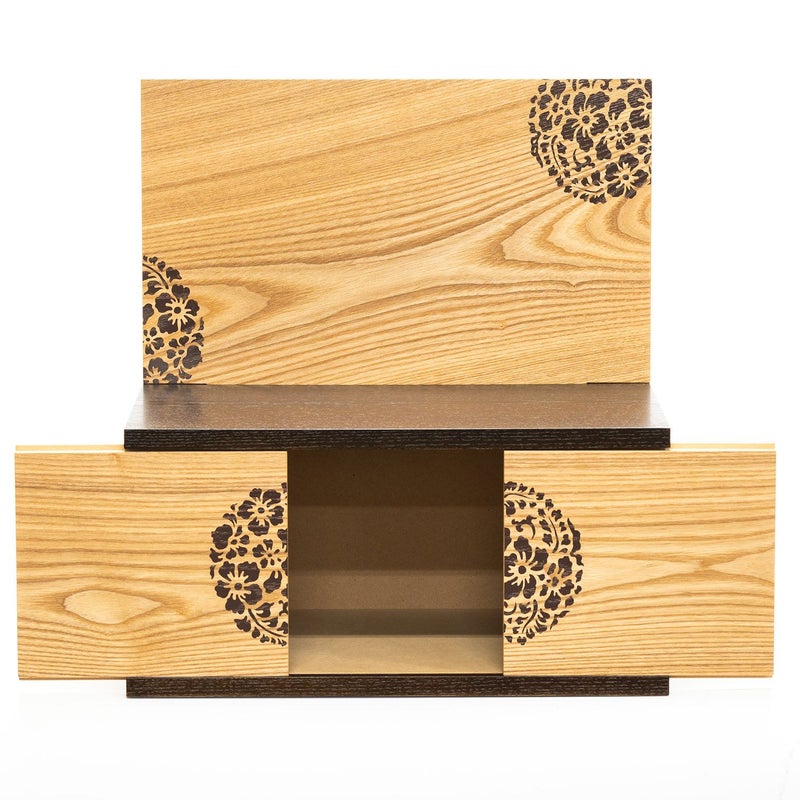 ■衝立式屏風、収納箱には「藤」の花を丸文で描きました。
