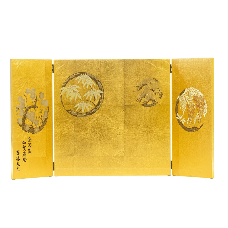 ■屏風には金沢箔を用い、丸紋に四季の花を加賀蒔絵で描きました。