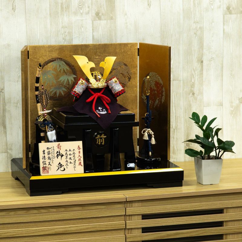金色に輝く華やかな屏風に、加藤鞆美作のグラデーションが美しい和紙小札兜を組み合わせました。