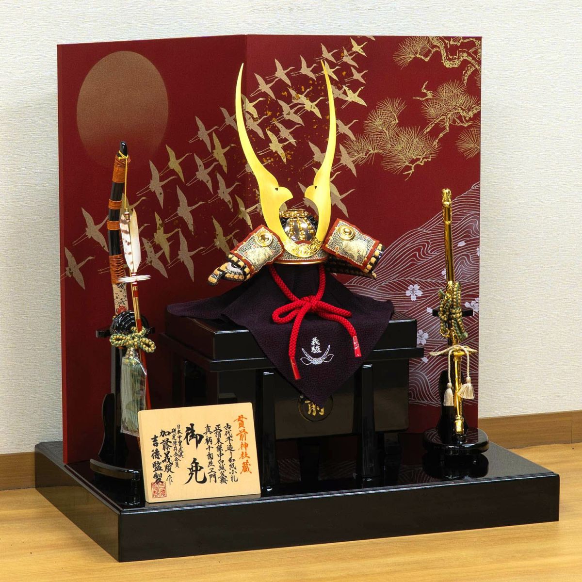 他の画像を見る 飾り付けサイズ間口48×奥行30×高さ42(㎝) 【五月人形】正絹萌黄肩橙縅 和紙小札1/4兜床飾り 加藤義駿作 価格 ¥ 220,000 税込 在庫切れ 詳細を見る お気に入りに登録する