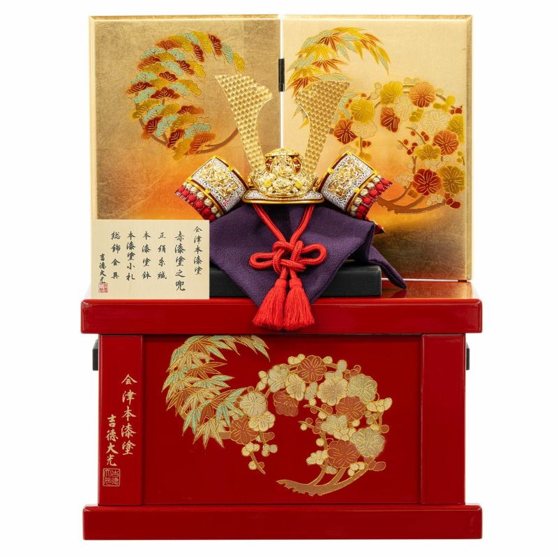存在感ある曙裾濃縅の兜を用いた兜収納箱飾りです。