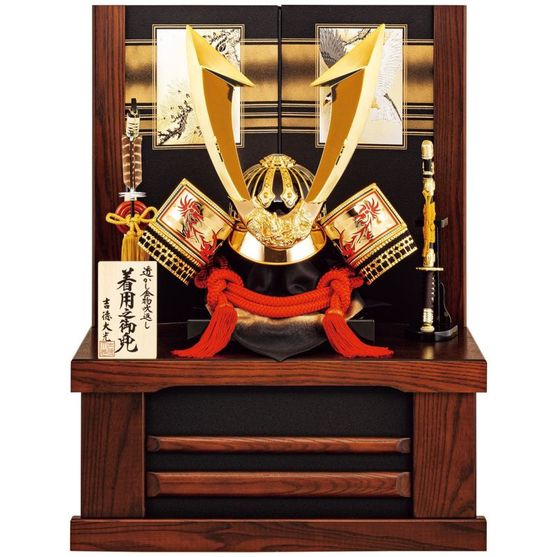 落ち着きある色合いの台屏風が、着用兜をより一層際立たせます。