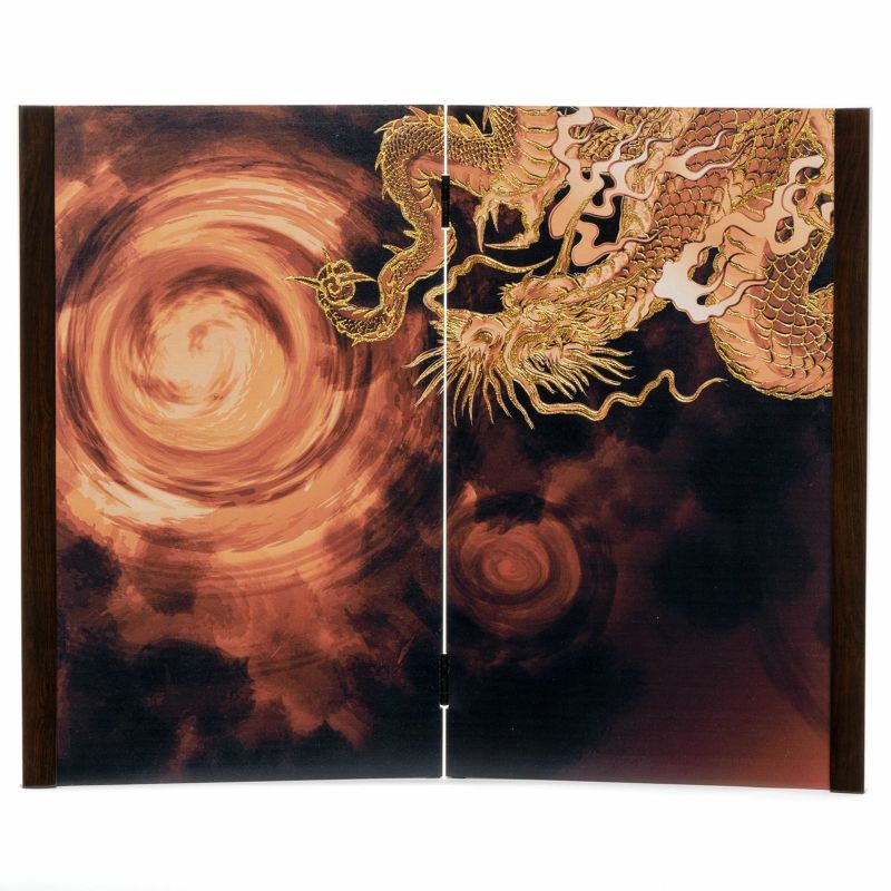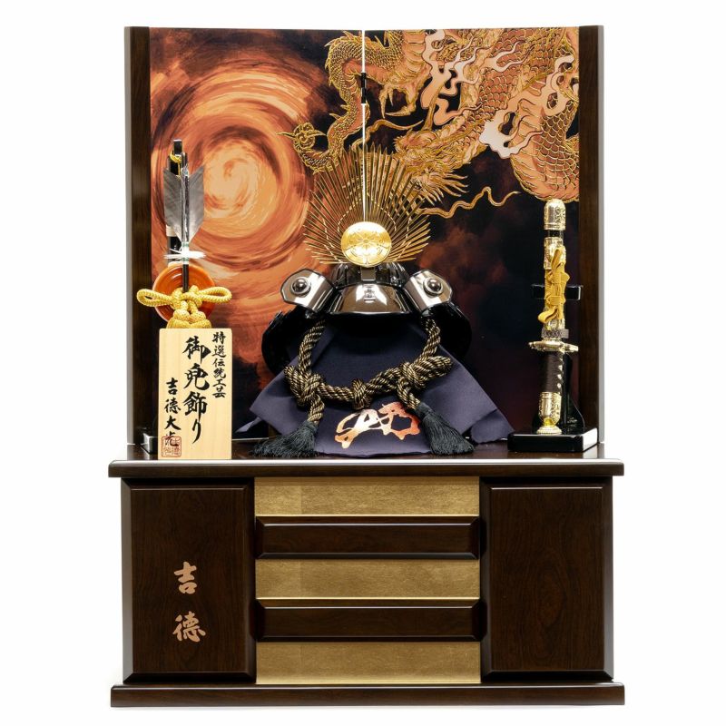 この兜を迫力ある龍を描いた二曲の屏風と組み合わせました。