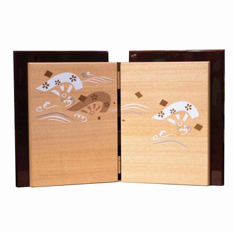軍配を持つ堂々とした佇まいが、木目の台屏風に映える鎧着大将飾りです。