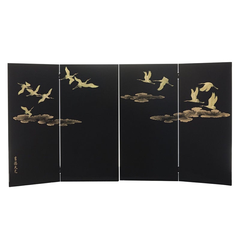 ■屏風は、駿河蒔絵で長寿を表す「鶴」を描きました。