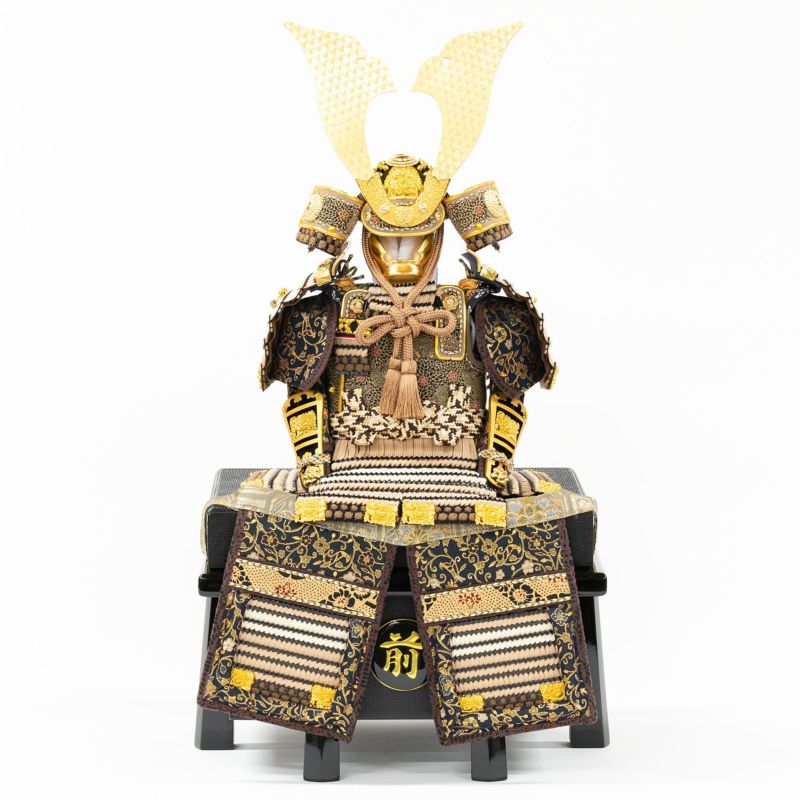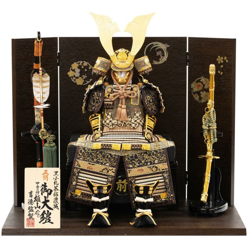 コンパクトサイズながらも、濃茶色の四君子(竹・菊・蘭・梅)を蒔絵で描いた屏風と組み合わせた、手の込んだ美しい造りの雄山作の大鎧です。
