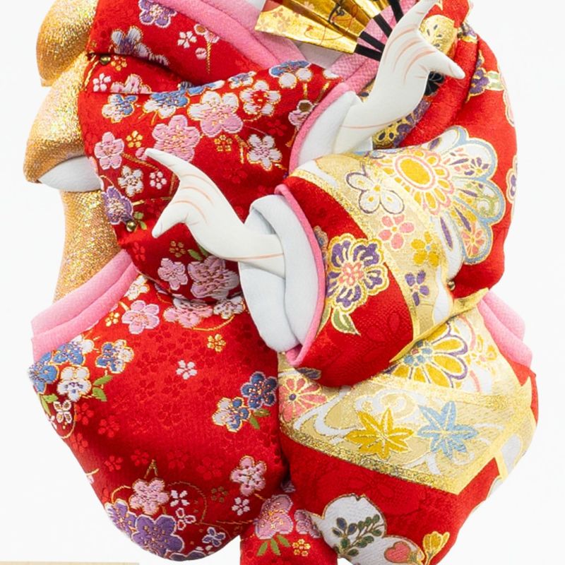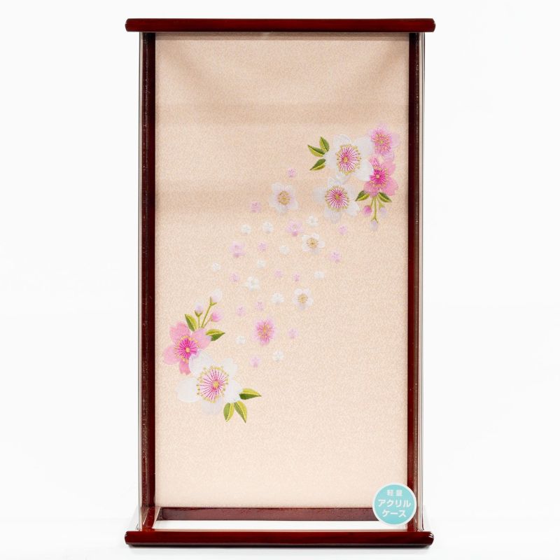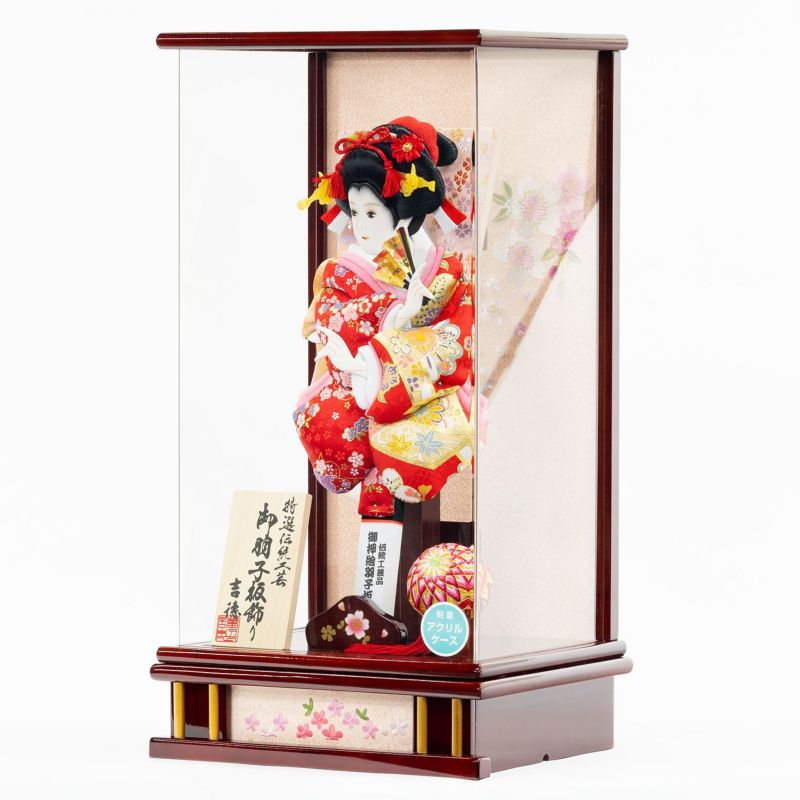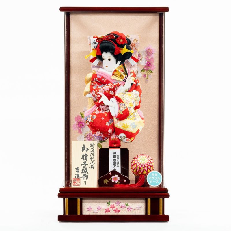13号サイズの羽子板飾りです。赤色の衣裳が上品な印象の羽子板を、茶塗のケースにセットしました。