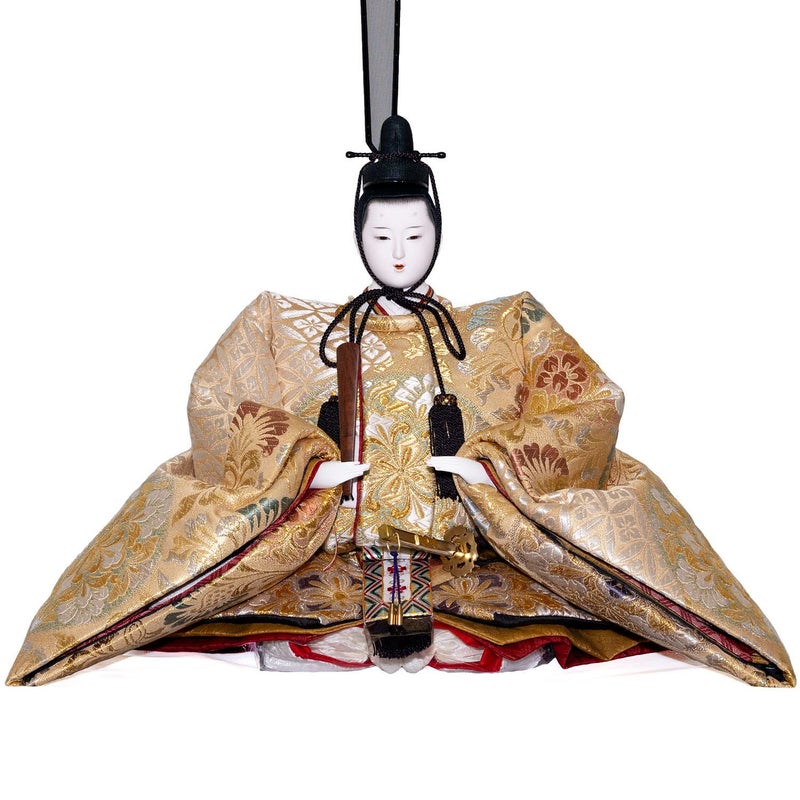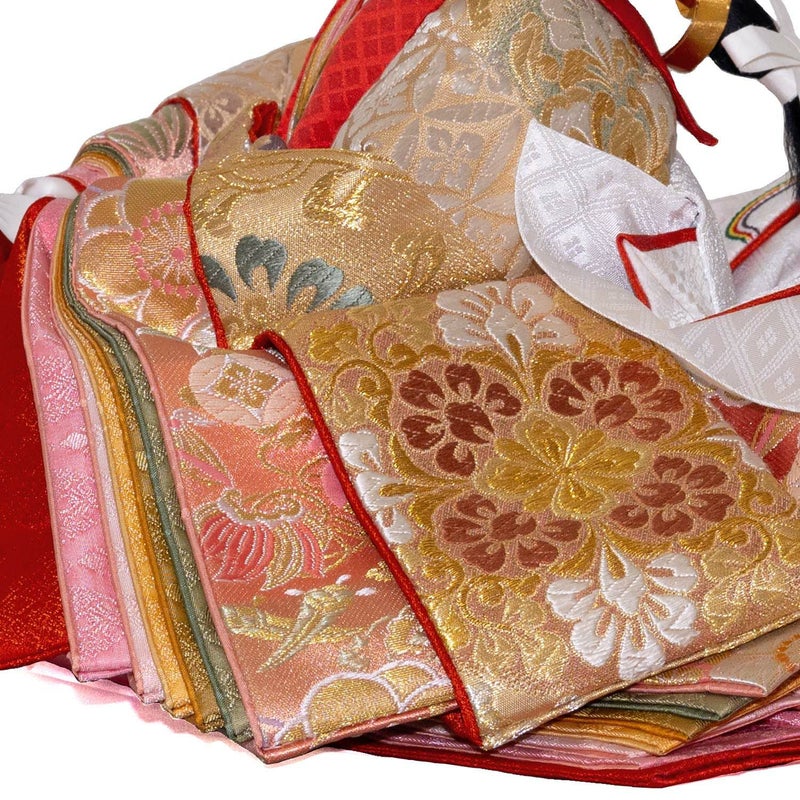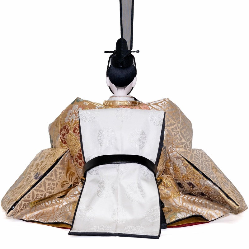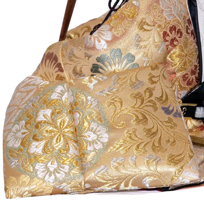 ■男雛・女雛には大輪の「唐花」が織りだされた正絹金襴衣裳を丁寧に着せ付けました。