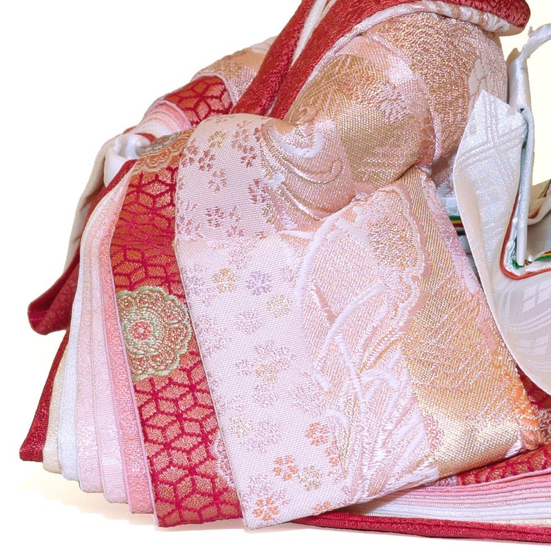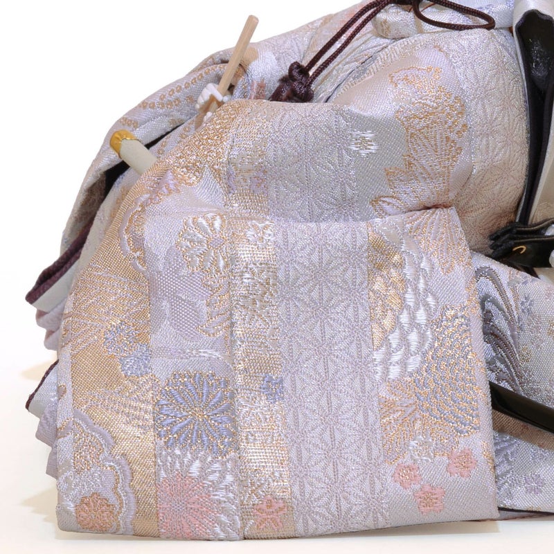 ■お人形の淡い色合いの衣裳には、豪華な金糸入り金襴を使用。