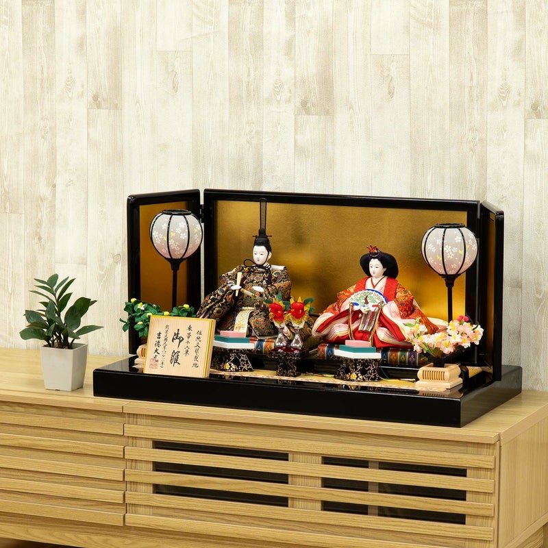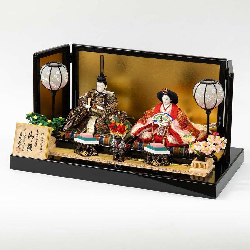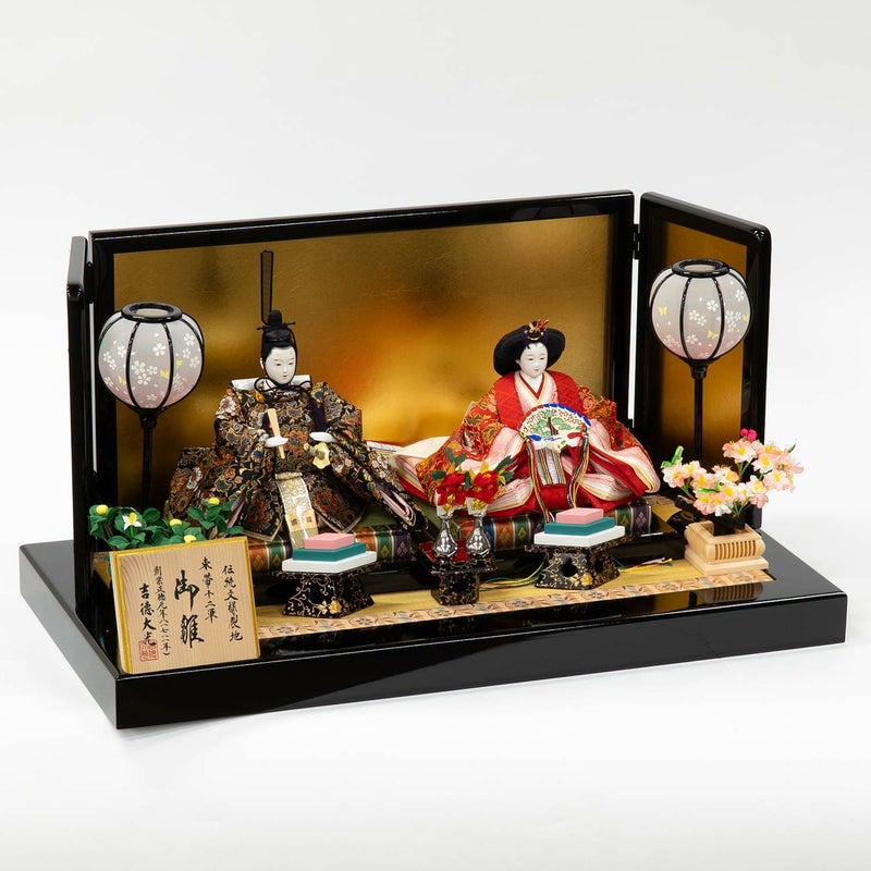 伝統文様衣裳をお人形に着せ付けた、オーソドックスな親王飾りです。