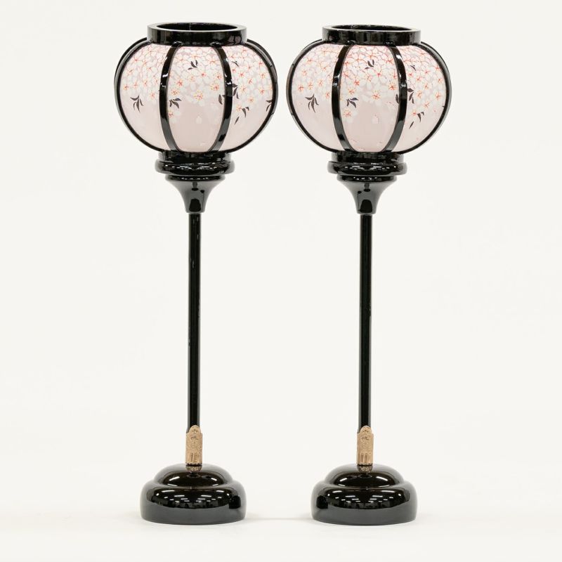 屏風には格子窓を用い大空を舞う鶴の姿を刺繍で描き、お雛様の前には木本来の優しい色合いの貝桶を配し、これに桜の蒔絵を施しました。