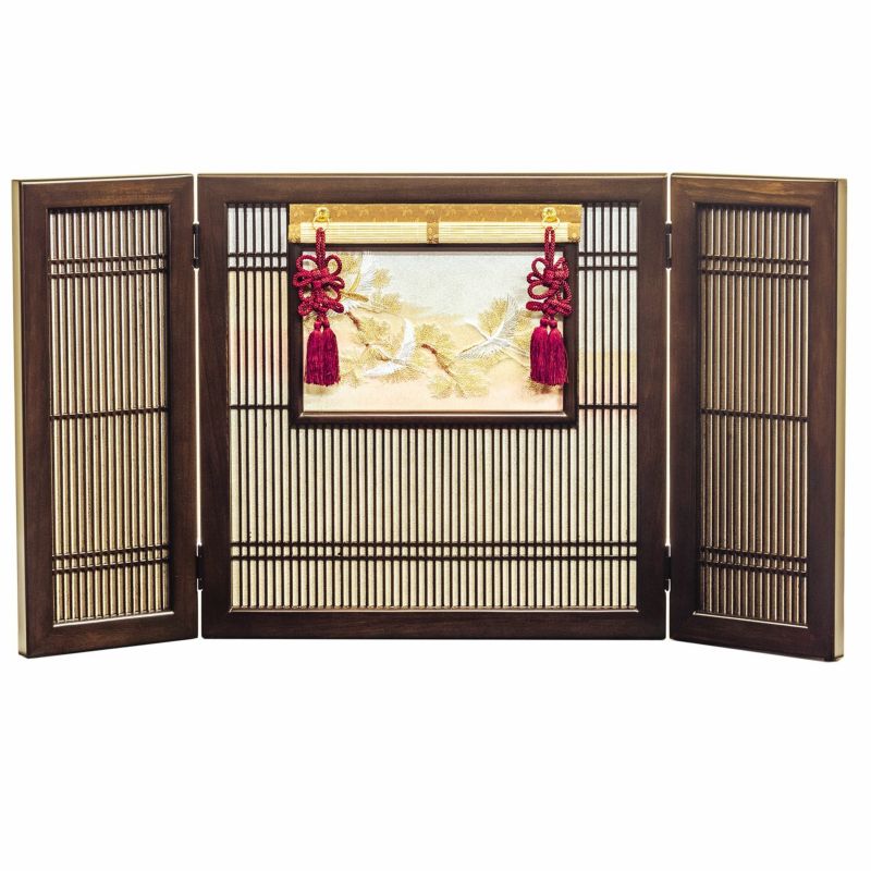 ■屏風には大きな格子窓を配し、大空に舞い上がる鶴の刺繍を施しました。