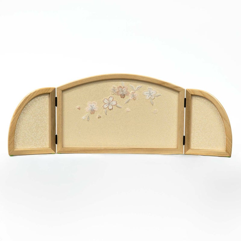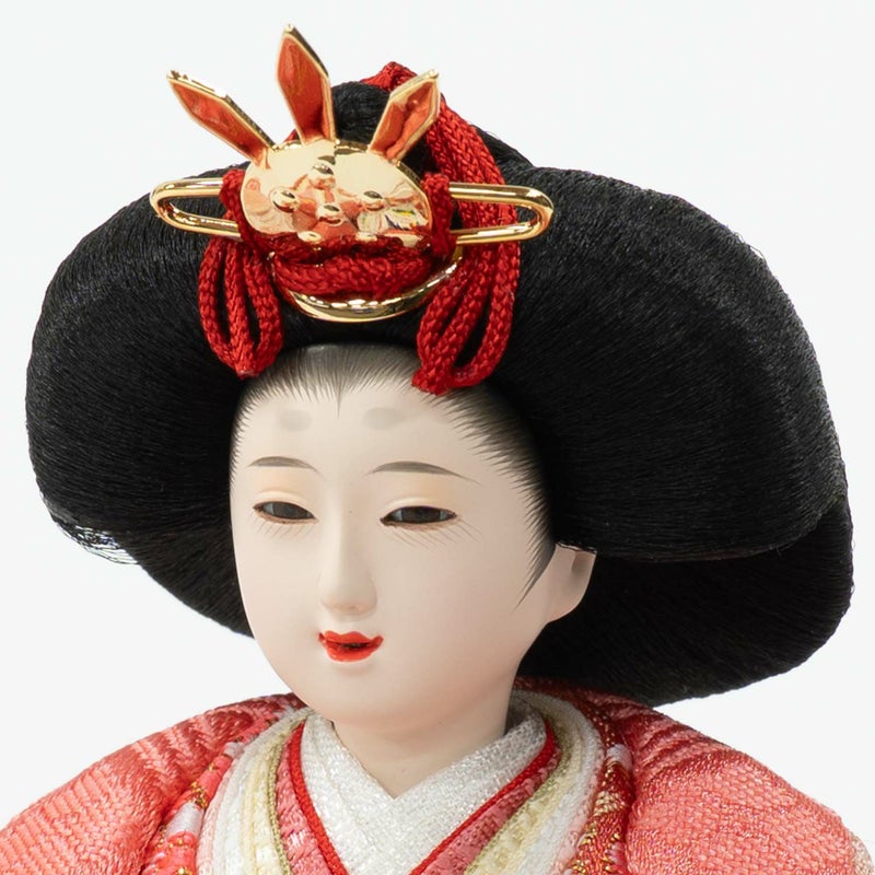 ■女雛は春らしい淡いピンク色に男雛と同じ桜柄衣裳を着せ付け。