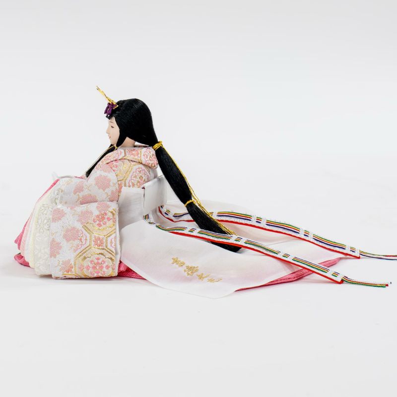■裾の長い衣裳に長い髪が印象的な女雛。