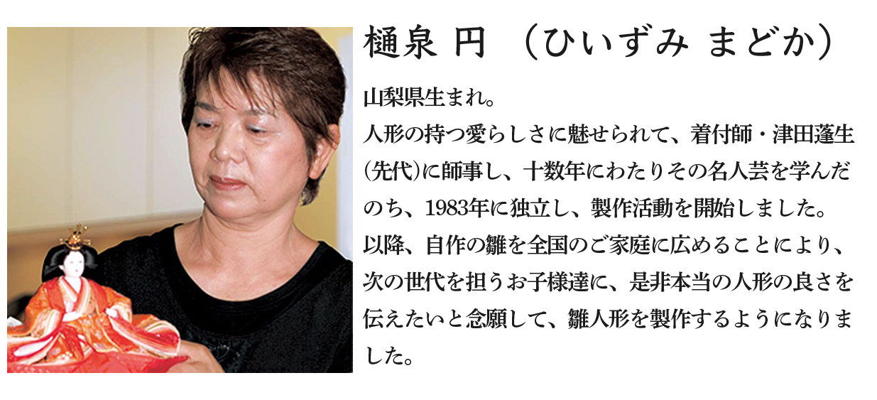 樋泉円の作る雛人形は、本仕立ての衣裳を着せ付けるため、非常な手間と技術を要します。