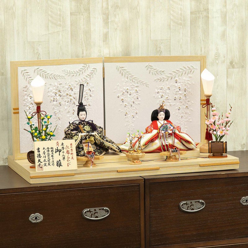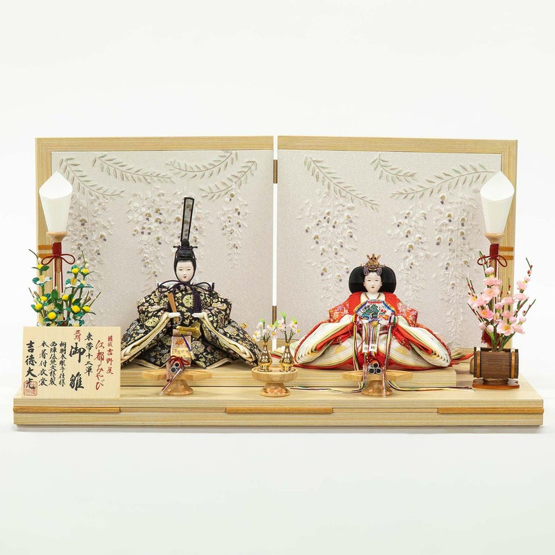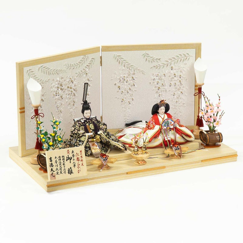 藤の花を刺繍した屏風に当社が自信を持っておすすめするお人形を合わせました。
