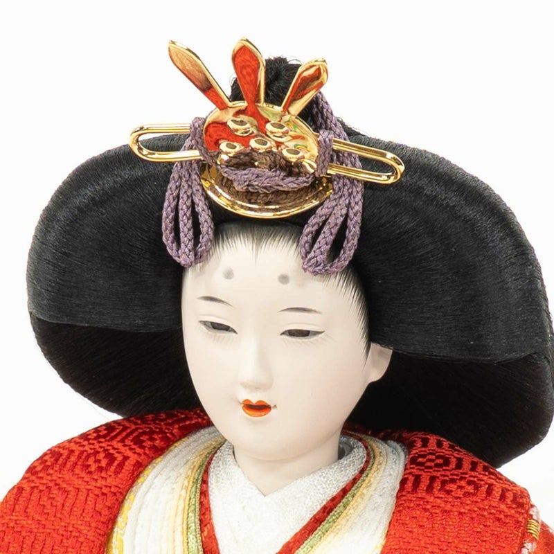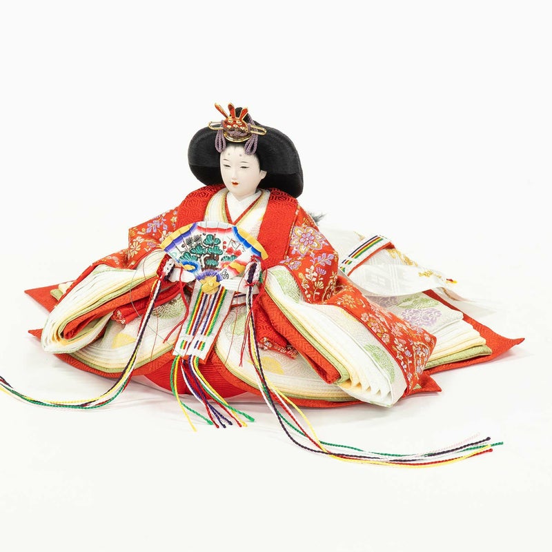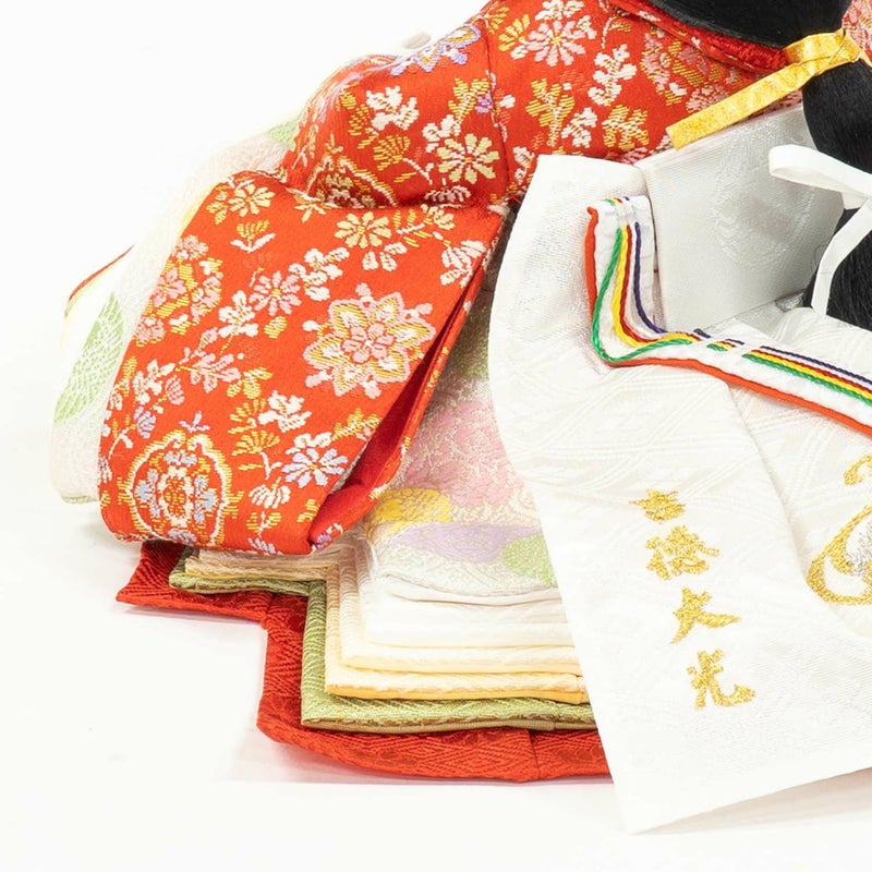 「江都みやびシリーズ」の男雛・女雛の衣裳は、正絹生地を用い、十二単を模した6枚剥ぎ。本物の衣裳のように丁寧に仕立ててから着せ付ける大変手間の掛かる本着せ付。