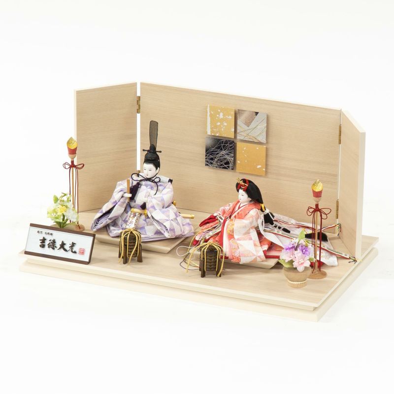 春らしい色合いの衣裳が木目の屏風に映えるおひな様。