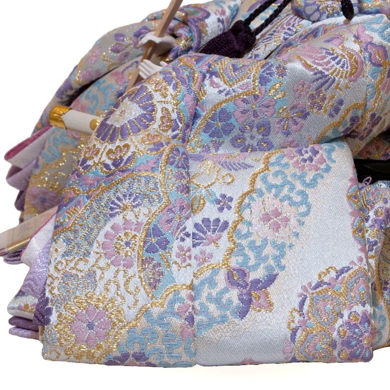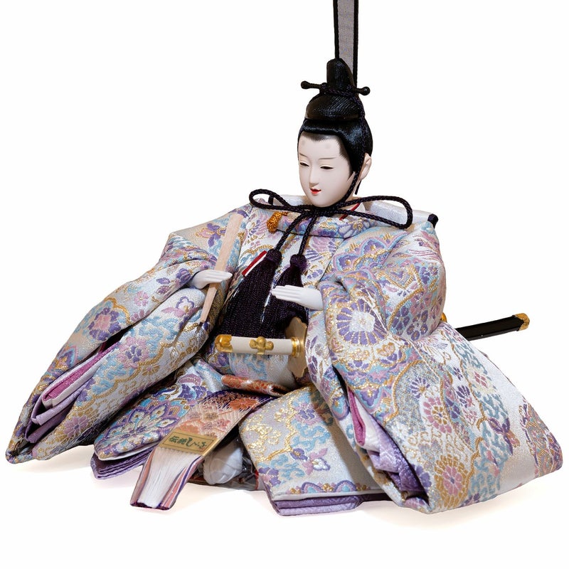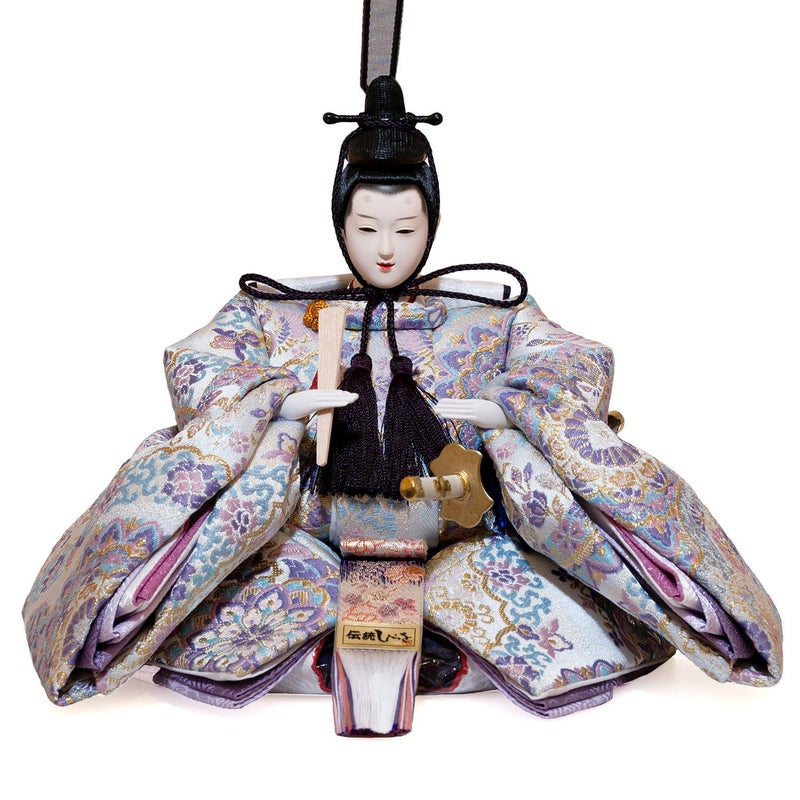 ■お人形には全体の色味に合わせ、淡い紫色の華やかな印象の「華文様」衣裳を着せ付け。