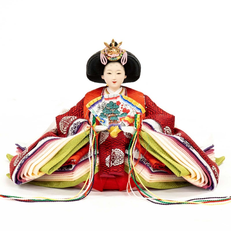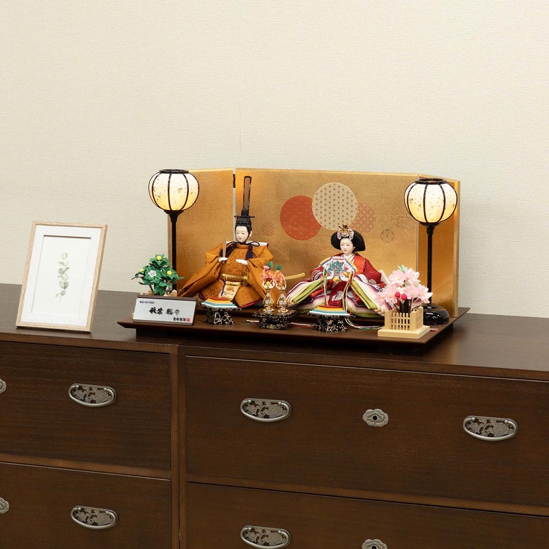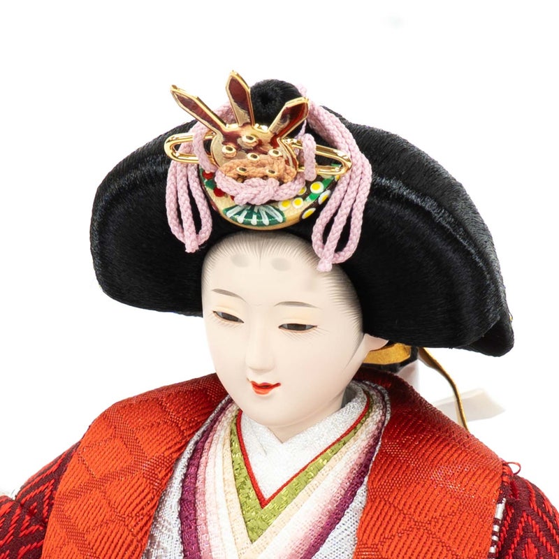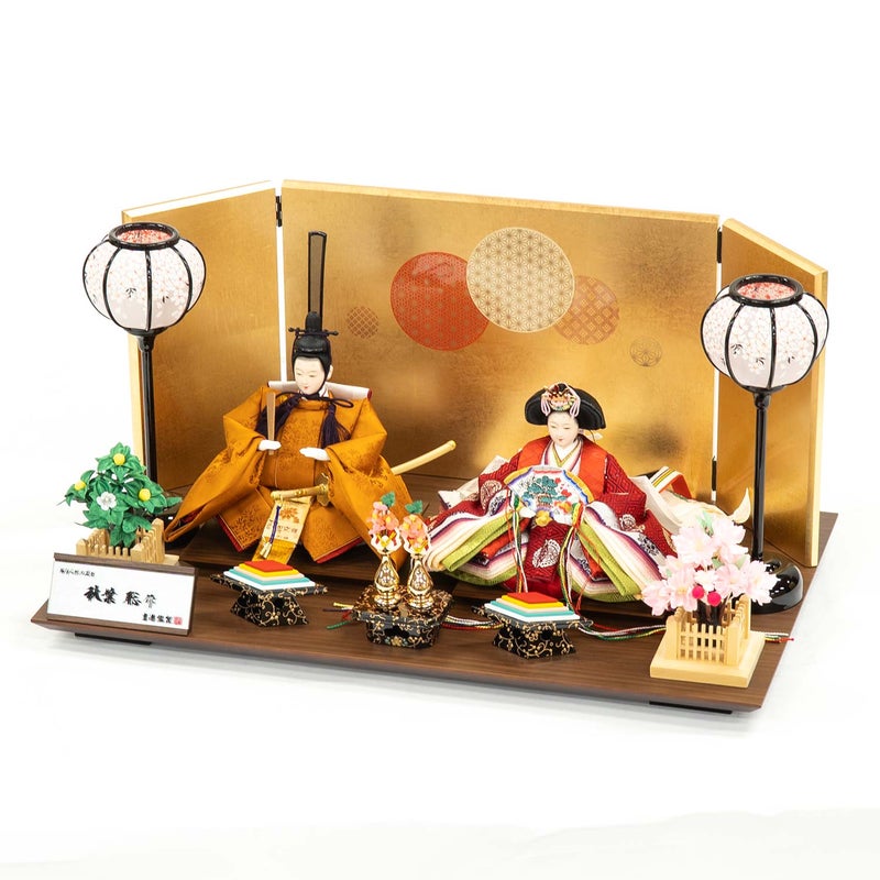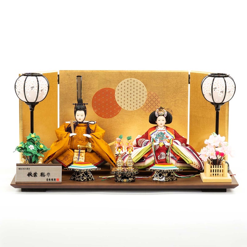 男雛には桐や竹、鳳凰、麒麟の文様が織り込まれた黄櫨染御袍を着せ付けた格調高い親王飾りです。