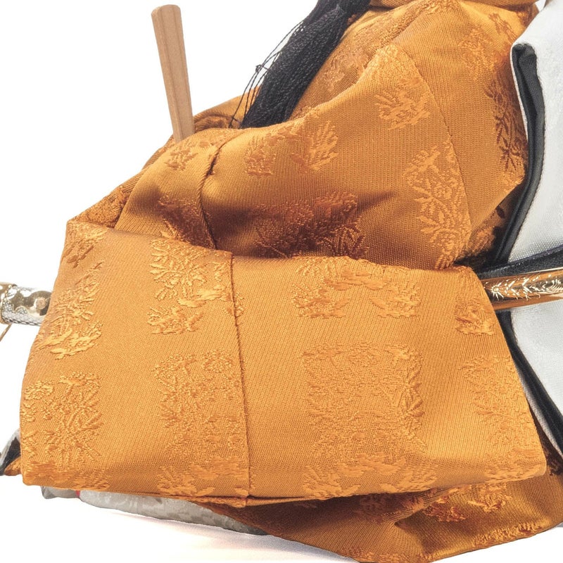 ■男雛には、天皇陛下のみが着用される“黄櫨染桐竹鳳凰文御袍(こうろぜんきりたけほうおうもんのごほう)”を写した正絹衣裳を着せ付け。