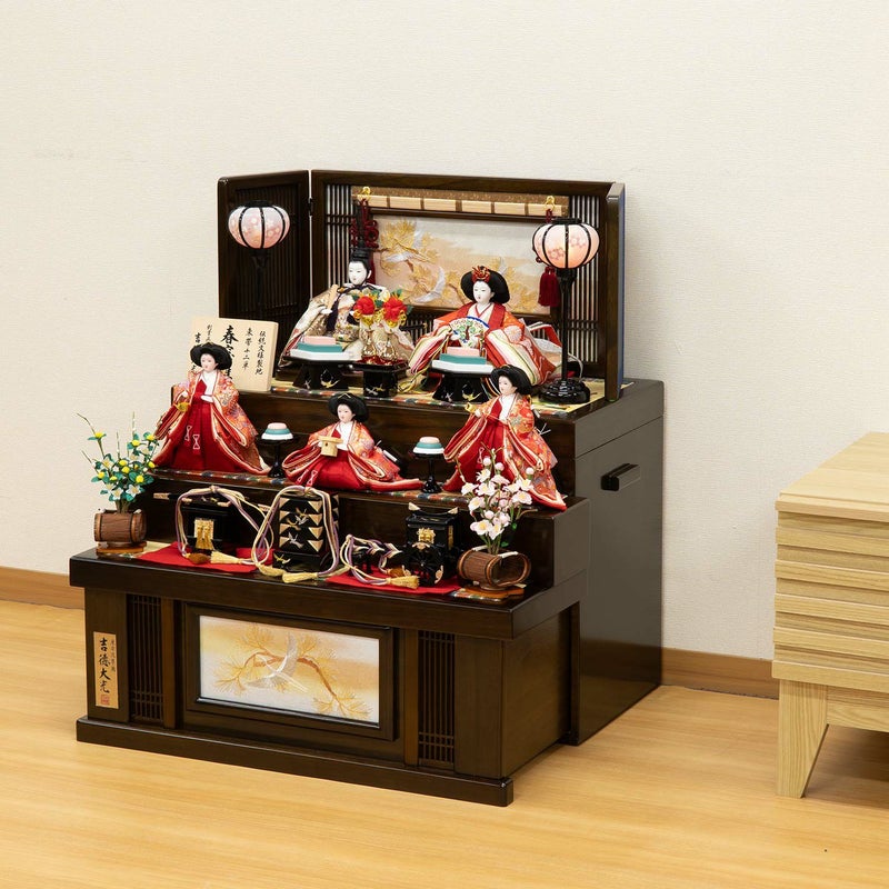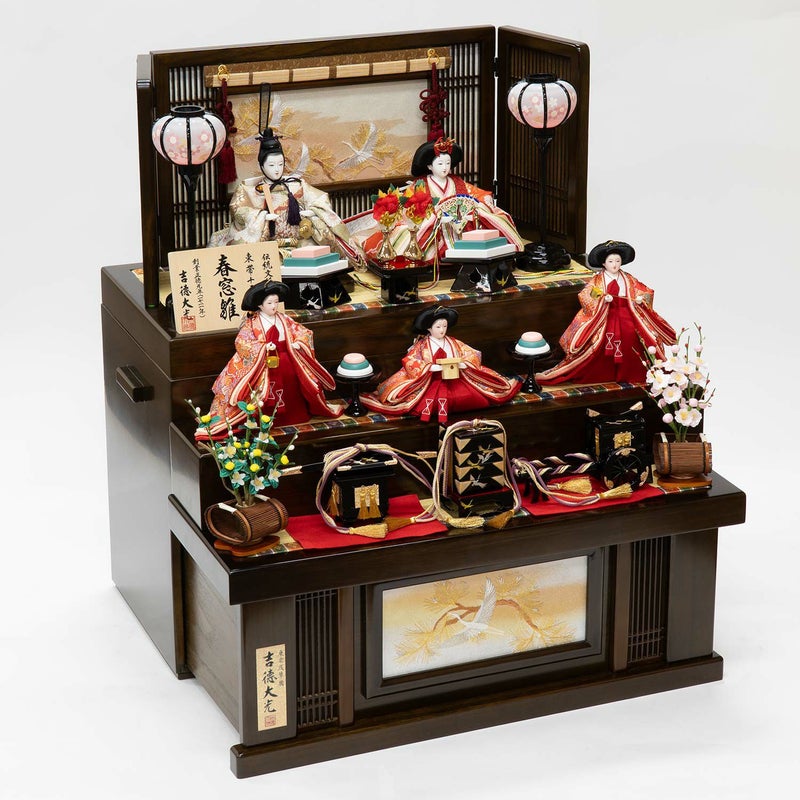 伝統の技に現代感覚を巧みに融合させた吉徳を代表とするベストセラー。背景の格子屏風と鶴の刺繍が印象的な雛飾り。