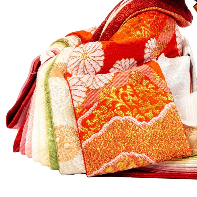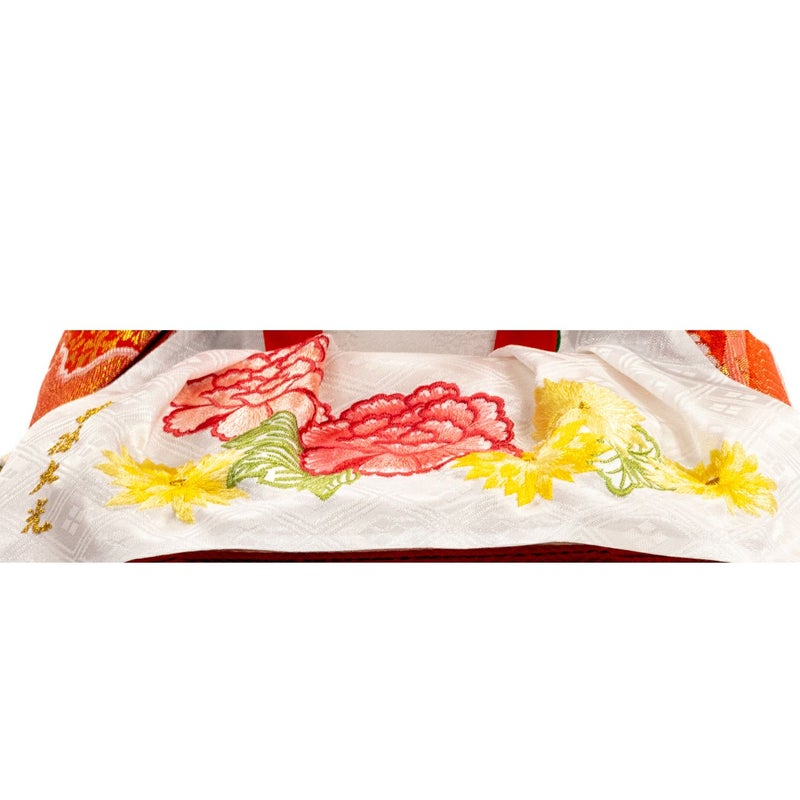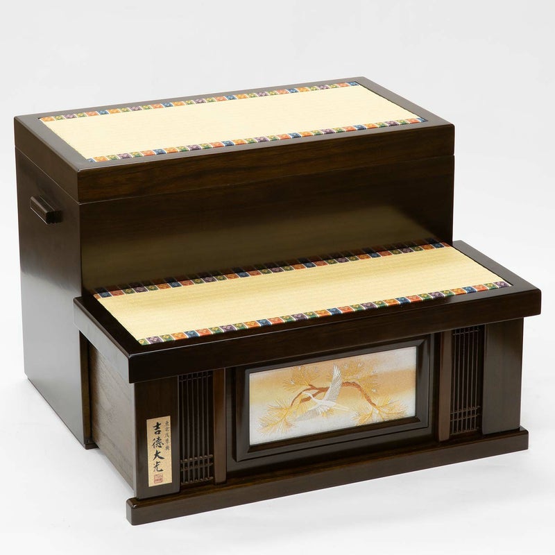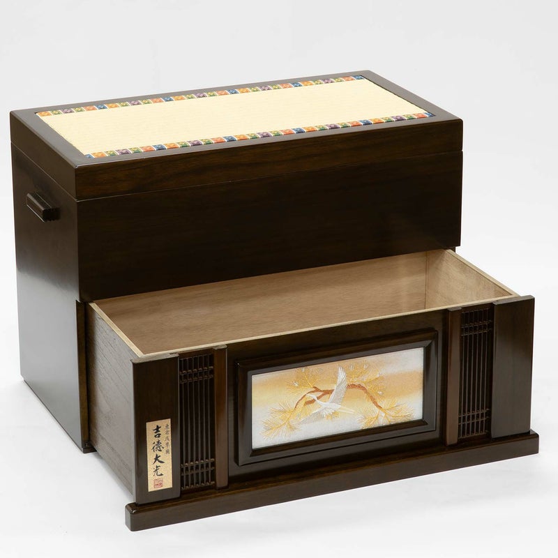 大空に舞い上がる鶴の刺繍が印象的な引き出し式春窓雛三段収納箱飾りです。